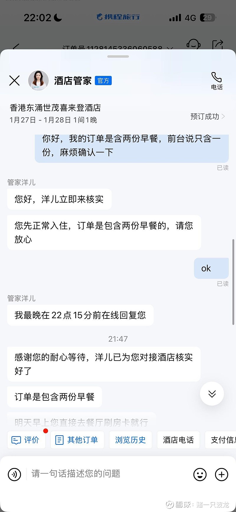 香港真是挺奇葩,世贸喜来登订的房间两份早餐,前台非说只有一份,要不是我提前对他们的服务质量有心理准备,我就跟他急了。App 白纸黑字写的含两份早餐,他巴拉巴拉说一堆没用的,真是服了$携程集团-S(09961)$ 看来携程赚钱是因为这个世界真的太拉跨了