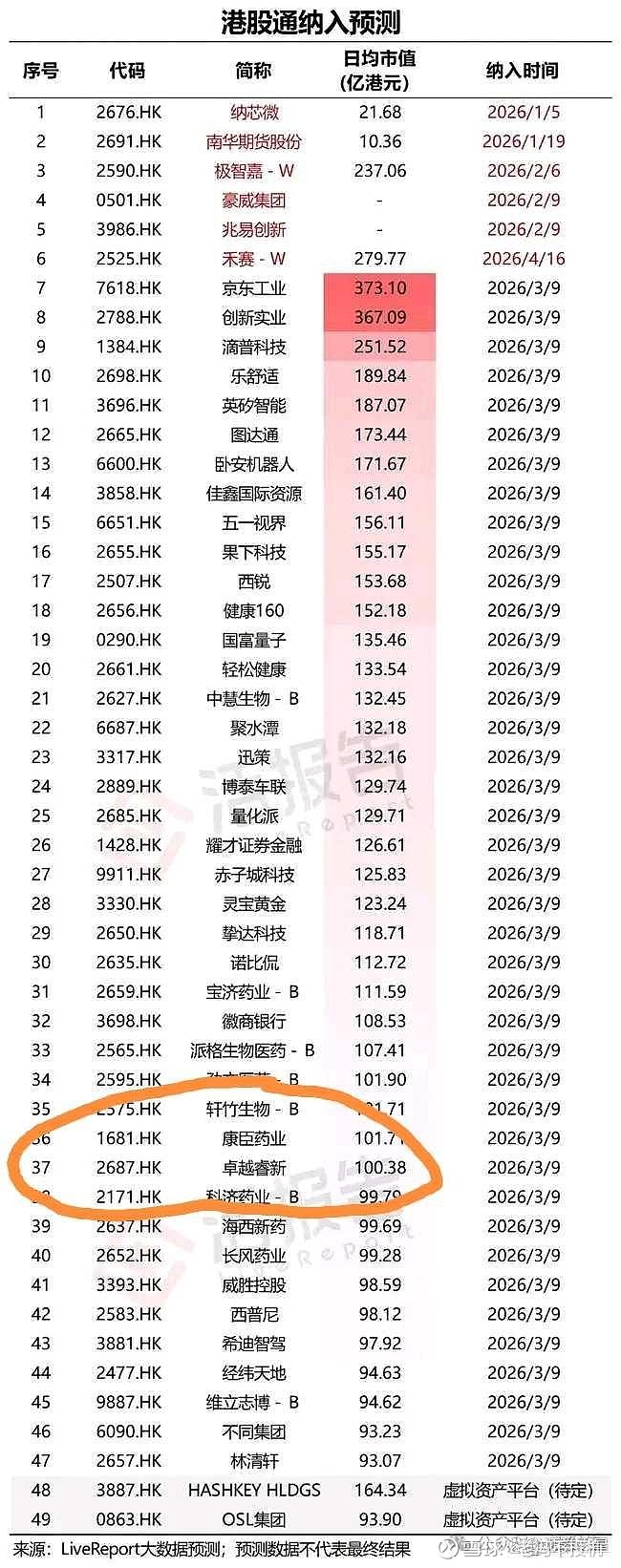$康臣药业(01681)$ 根据LiveReport,本次有望纳入的公司有:京东工业、创新实业、滴普科技、乐舒适、英矽智能、赤子城科技、图达通、卧安机器人、佳鑫国际资源、五一视界、国富量子、果下科技、西锐、健康160、轻松健康、中慧生物-B、聚水潭、迅策、博泰车联、量化派、耀才证券金融、灵宝黄金、挚达科技、派格生物医药-B、劲方医药-B、诺比侃、宝济药业-B、徽商银行、轩竹生物-B、长风药业、康臣药业、卓越睿新、科济药业-B、海西新药、维立志博-B、威胜控股、西普尼、希迪智驾、经纬天地、不同集团、林清轩等41只股票有望于2026年3月9日的定期检讨中纳入港股通。HASHKEY HLDGS、OSL集团等2家虚拟资产交易平台能否纳入港股通有待观察。