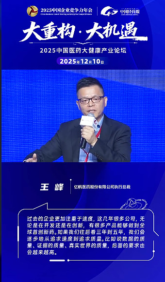 亿帆医药股份有限公司执行总裁王峰:过去的企业更加注重于速度,这几年很多公司,无论是在开发还是在创新,有很多产品能够做到全球首创新药。如果我们往后看三年到五年,我们会逐步地从追求速度到追求质量。比如说数据的质量、证据的质量、真实世界的质量,后面的要求也会越来越高。