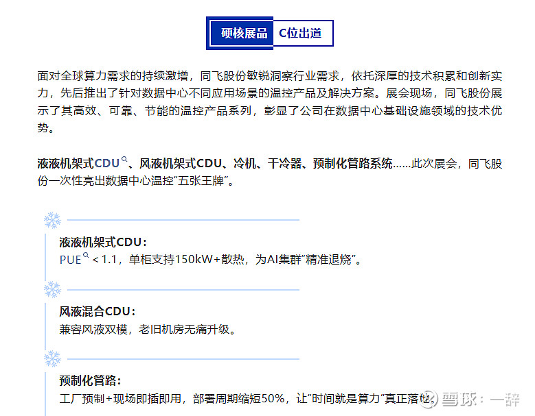 $同飞股份(SZ300990)$英伟达刚发了CDU技术标准文件,《CDU Requirements Document Rev 1》,再看一下同飞股份AIDC布局,同飞官方亮相“五款产品”,同飞产品规模全,国内大厂认证完成,台企海外链逐步认证,在液冷板块几个票中明显低估。来源:同飞股份官方公众号网页链接