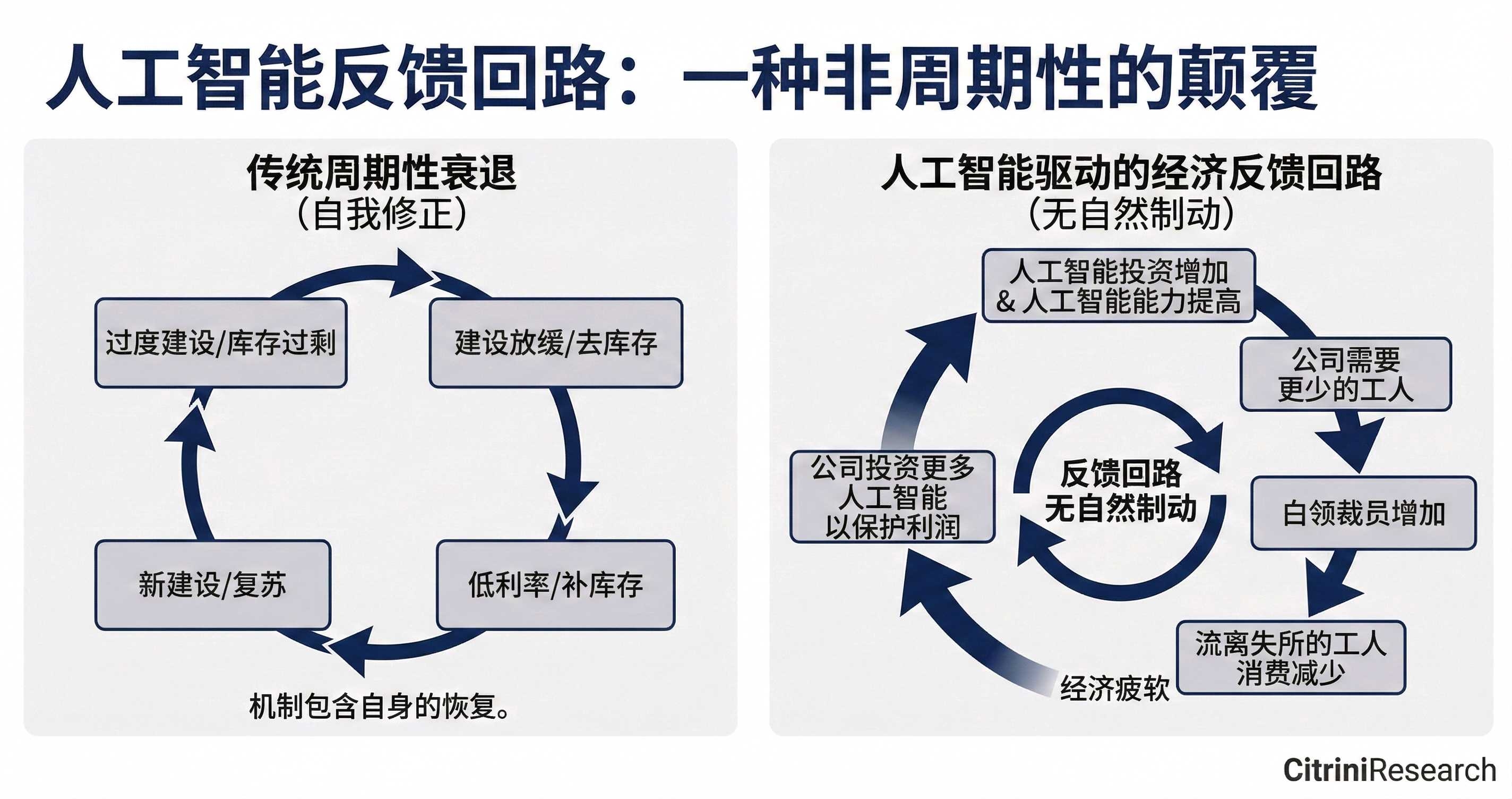 AI 成功 → 企业裁员 → 利润率上升 → 股价上涨 → 继续投资 AI → 更多裁员。这是一个没有自然刹车的负反馈循环。GDP 数字还在增长(生产力爆炸),但这是"幽灵 GDP"——产出出现在国民账户里,却不在真实经济中循环。因为机器不买商品,消费者经济在萎缩。