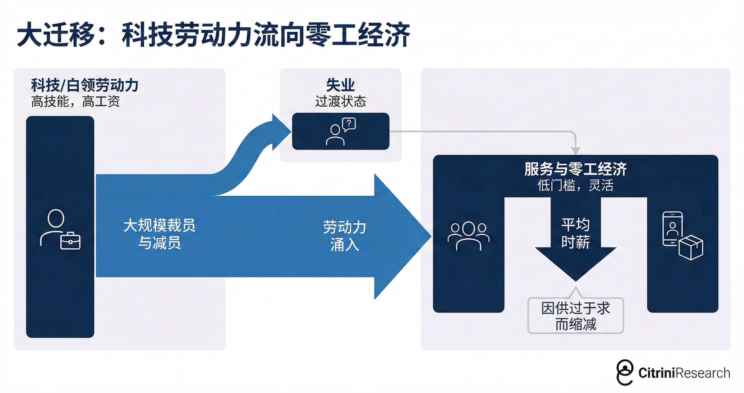白领是美国就业的 50%,但驱动约 75% 的可支配消费支出。顶层 10% 收入者贡献超过 50% 的消费支出。这些人失业后先用储蓄维持表面正常(滞后 2-3 个季度),然后集中引爆。PM 从 18 万年薪降到开 Uber 的 4.5 万——这个故事乘以数十万人,就是整个服务业工资被压垮。