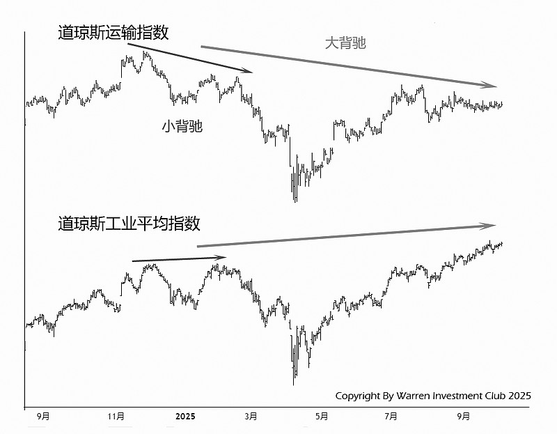 2025.10.03【道琼:道氏理论“背驰”初露】$道琼斯指数(.DJI)$ $标普500指数(.INX)$ $运输指数ETF-iShares(IYT)$