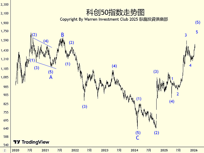 由人工智能所带动的科创50指数行情,我认为,将进入尾声。看图,以芯片股为代表的科创50指数走势,其波浪趋势首选数浪方式是自2024年2月低点以来的升浪已经进入(5)浪5阶段。尽管第5浪可能会延长一段时间,但不改变属性。