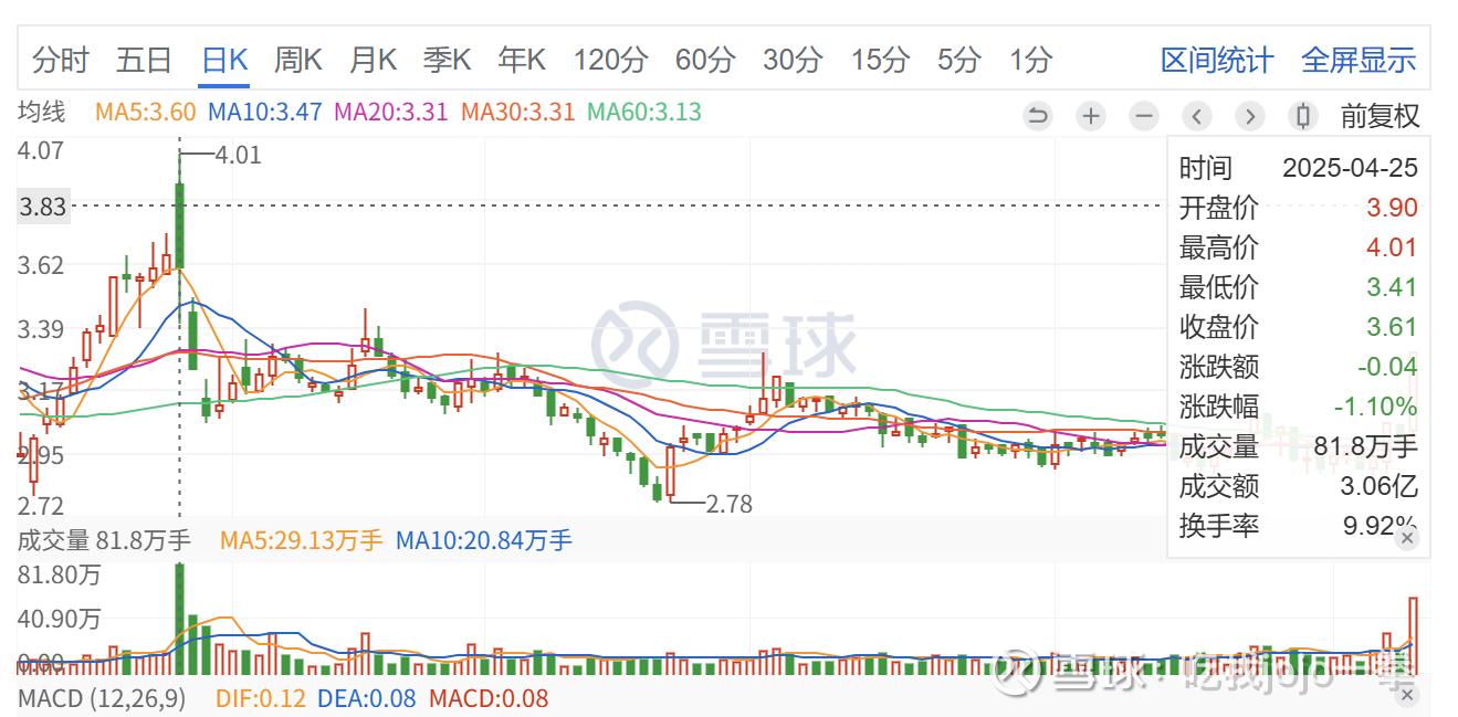 前高巨量为4月25日涨-1.1%(4月10日后),81万手股价收盘3.61,最高4.01,此后开启量价齐跌暴跌模式