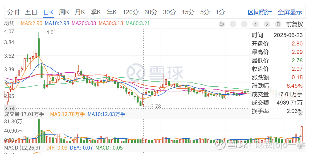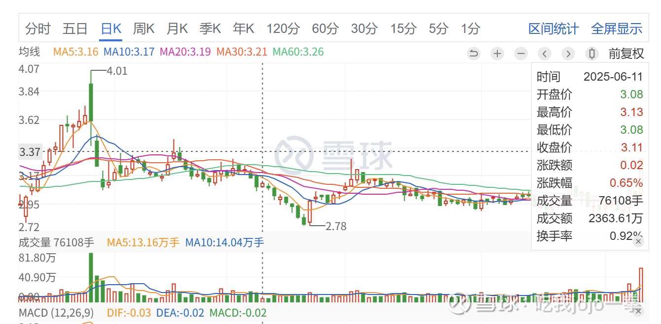 结合前高并无涨停,此股磨盘久,地量地价不一致,但底部放量拉升,地量出现频繁,长期无人问津,不放量涨停,阻力小,看好后续继续走强,直至巨量收绿,破前高4.01问题不大。