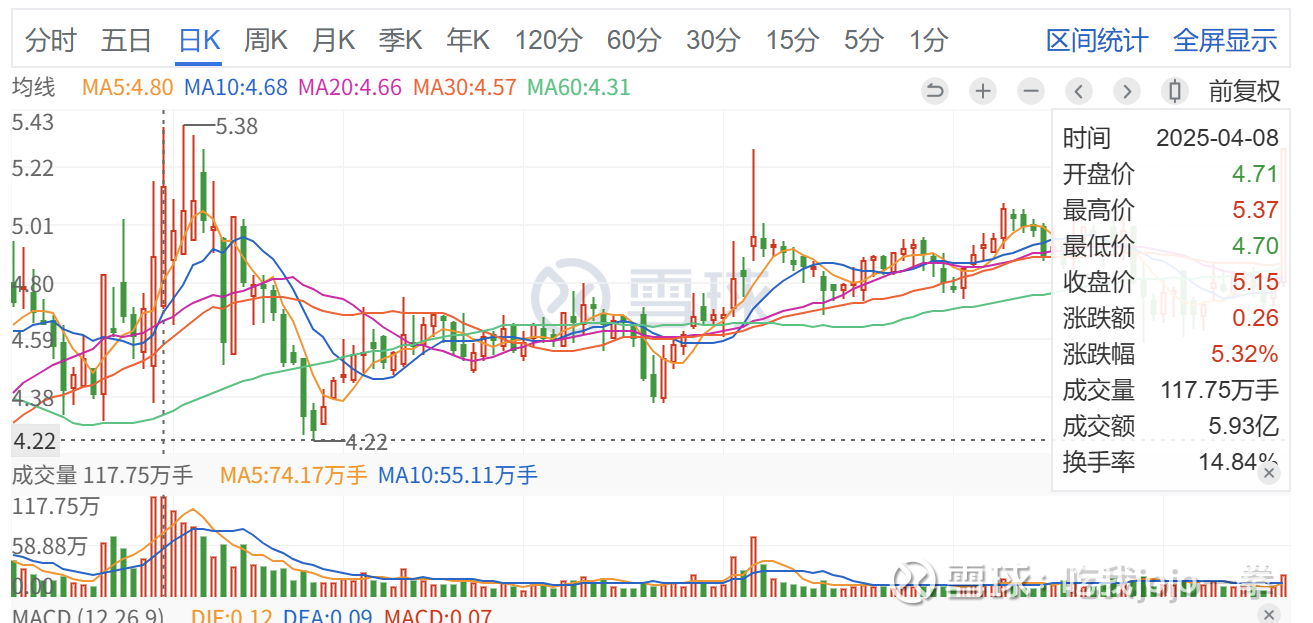 前高巨量为4月8日(4月10日前),117万手股价收盘5.15,连续两天巨量但未能涨停,此后虽冲高但收盘更低,后下跌消耗涨幅,虽17日涨停,但缩量后续加速下跌探底,此番走势值得警醒。