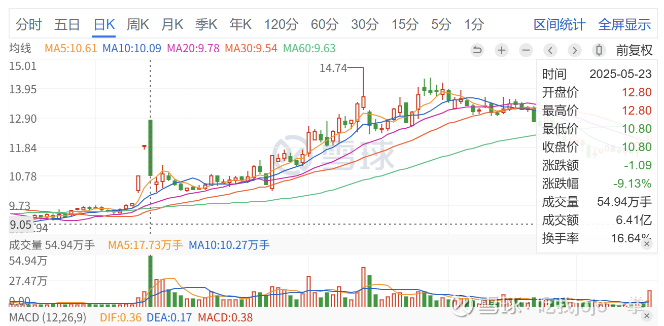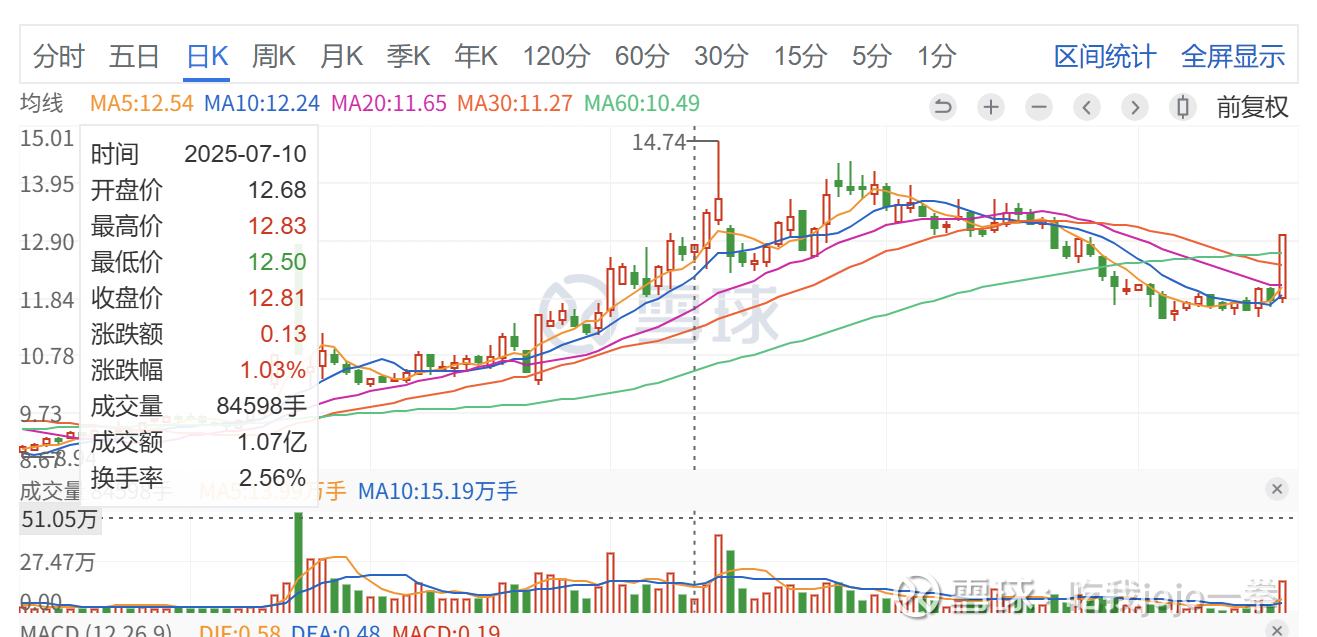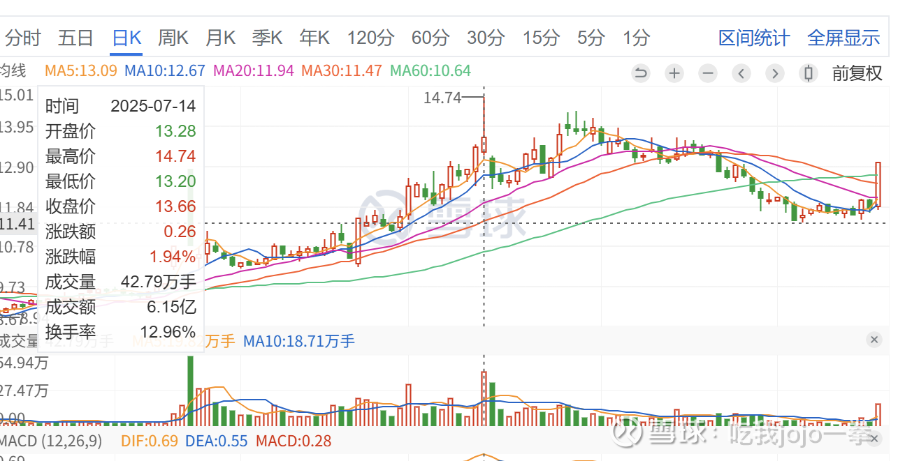 二次冲高7月14日,放量42万手,收盘价13.66,超越前高,最高14.74创阶段高点,后续量价回调
