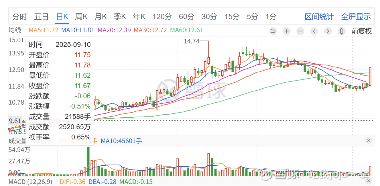 二次地量出现地价,9月10日仅2万手,价格11.67,平台盘整,后缩量涨停