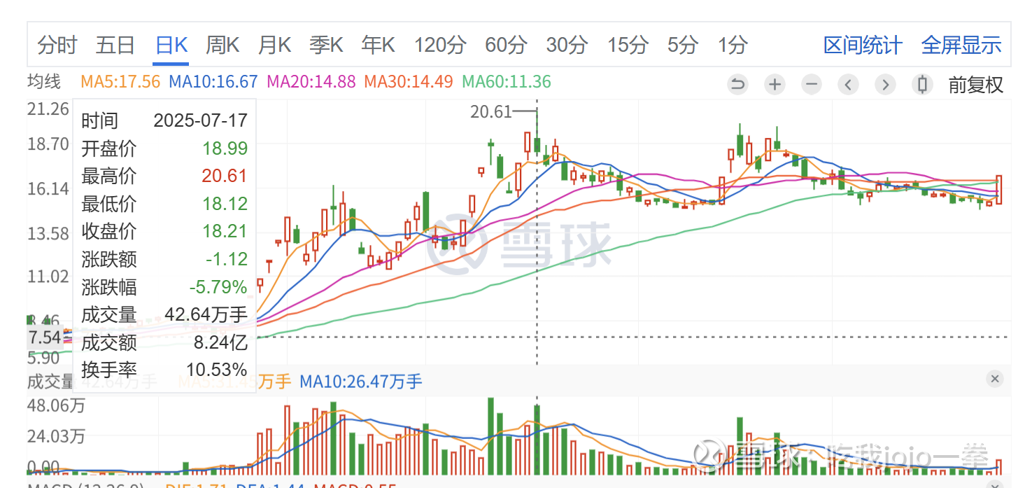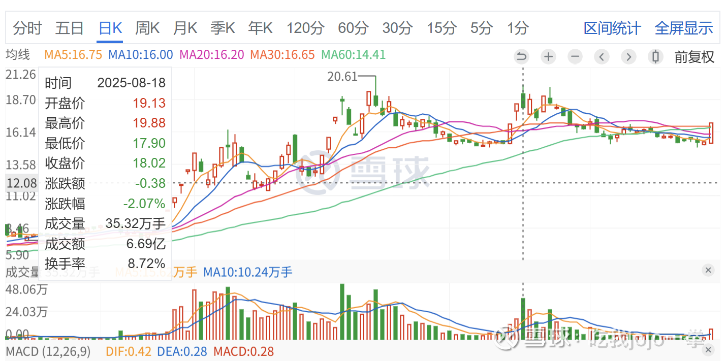 前高巨量为7月17日(4月10日后),42万手股价最高20.61,当日新高巨量收绿,此后盘整,缩量快速下跌消耗涨幅