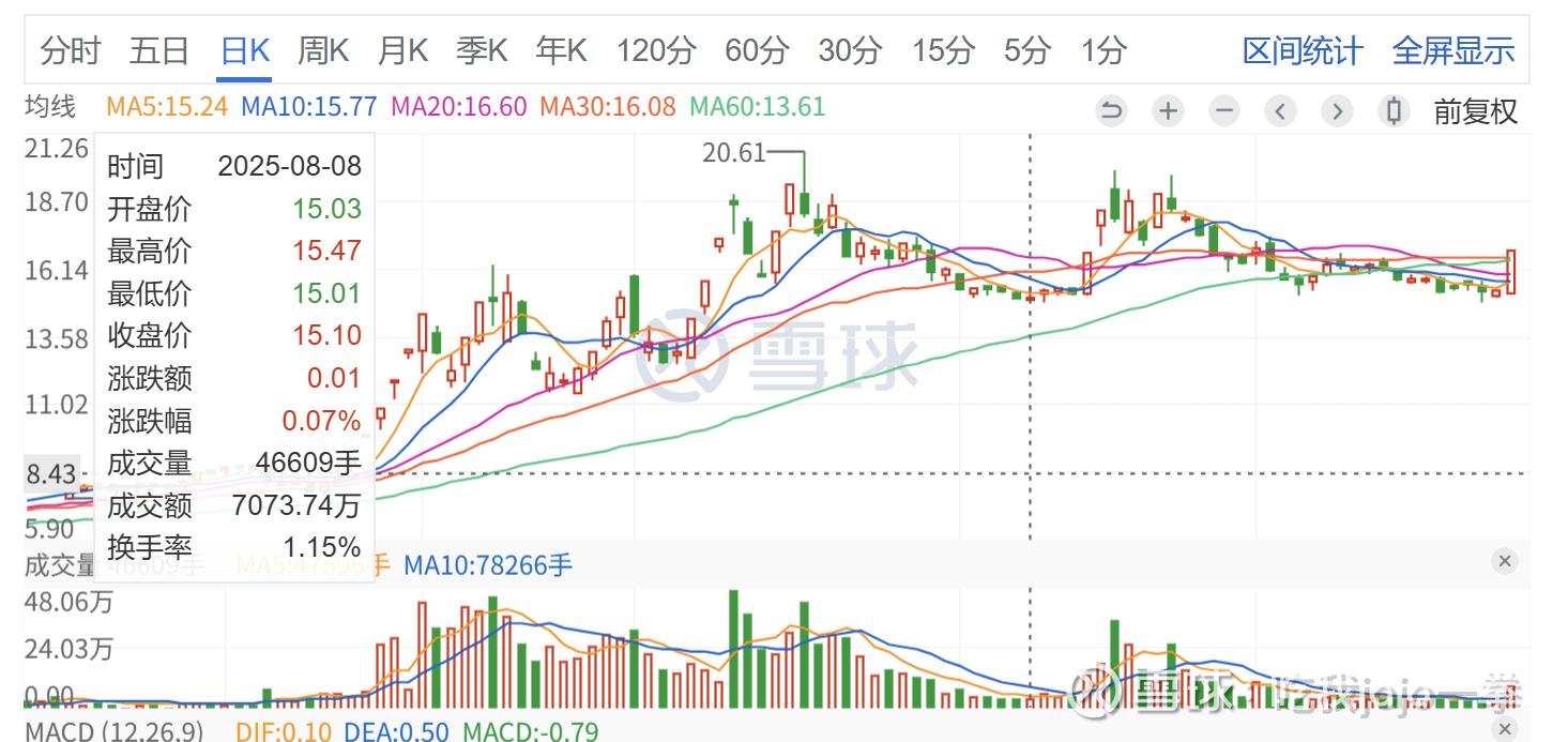 新高后缩量下跌,地价地量同时出现,8月8日地价最低15.01,4.6万手