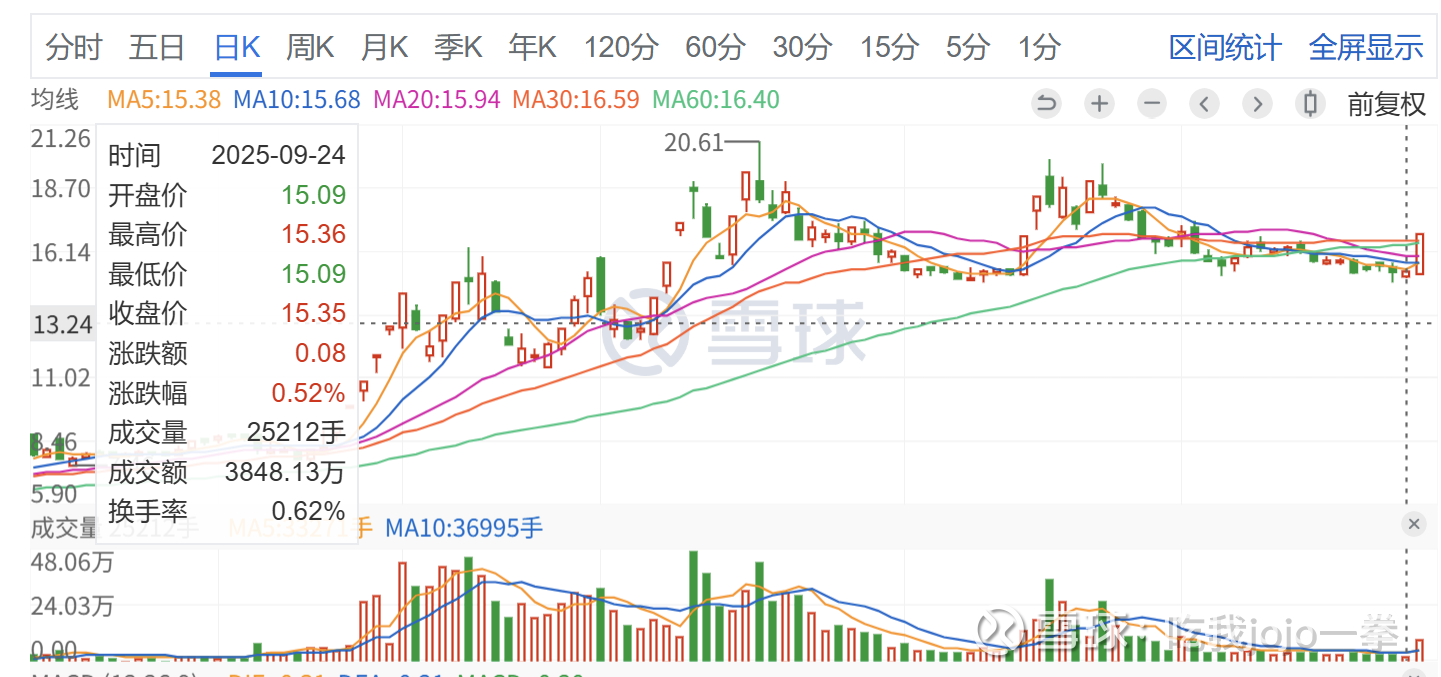 今日9月25日封板成交10万手,量接近前高1/4,价格16.89,与前高还有一定距离