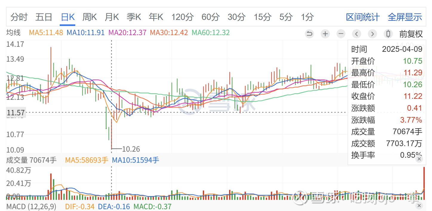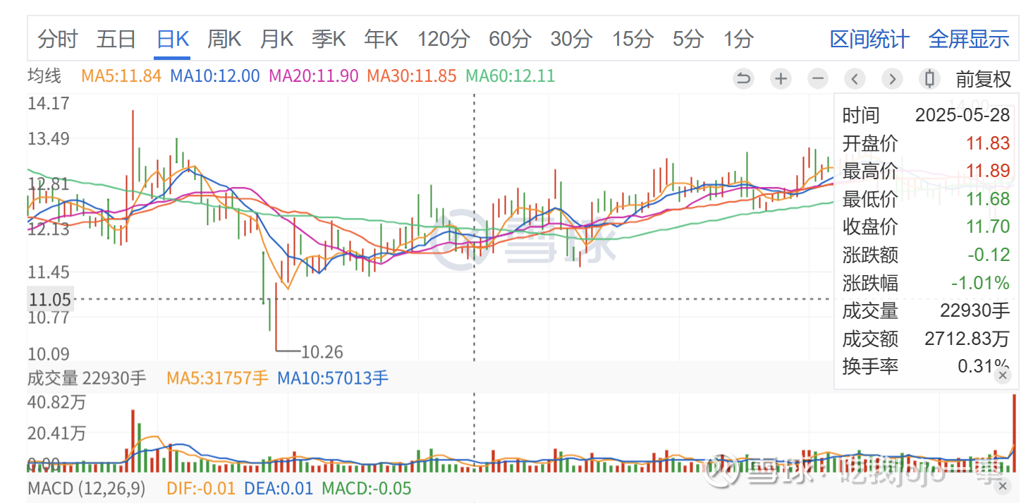 地量构筑平台底部,5月28日2万手,最低11.68,收盘价11.7,后期冲量又回踩