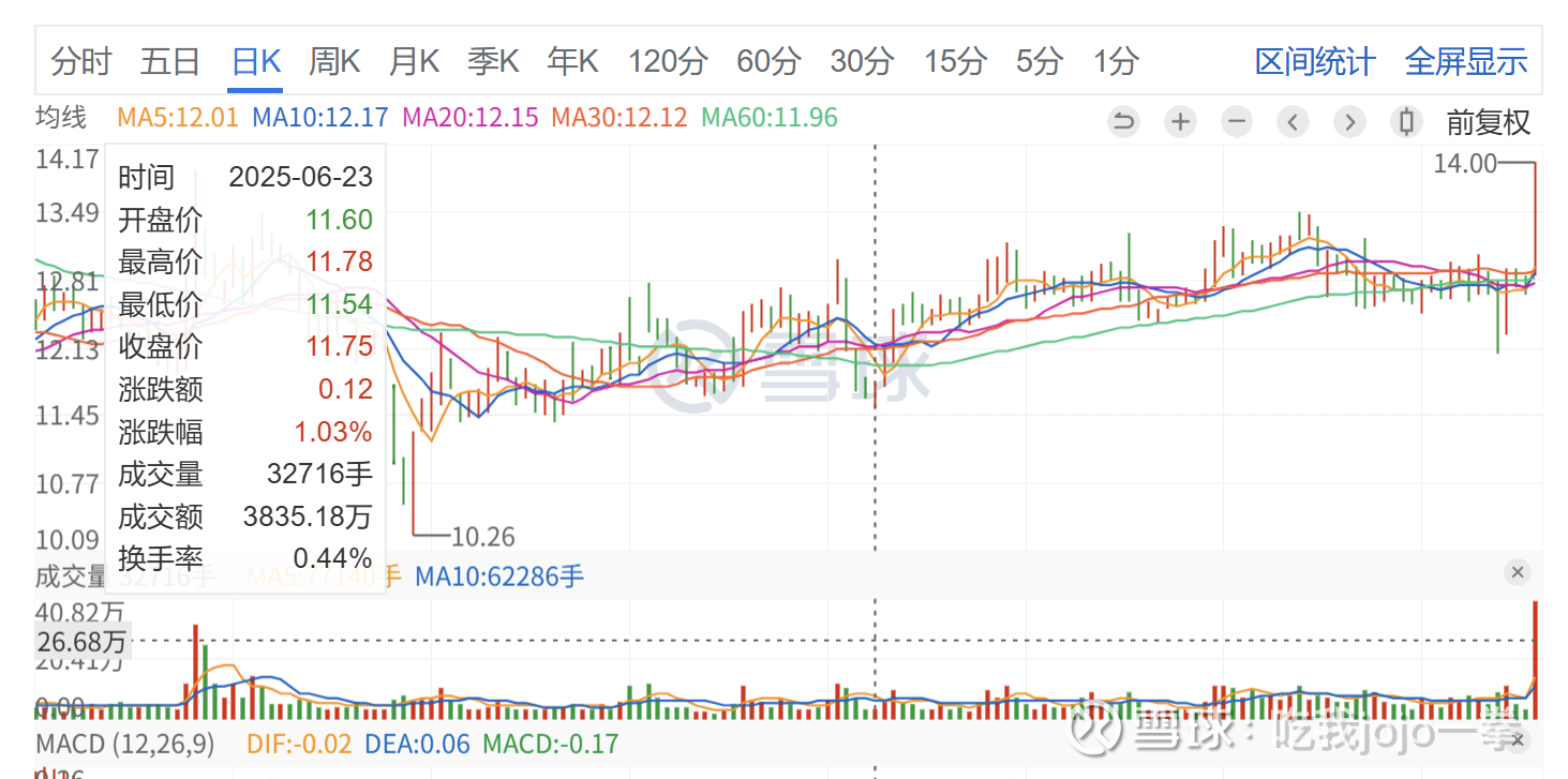 二次回踩,6月23日,3万手,最低价11.54,收盘价11.75,不破前期量价底部