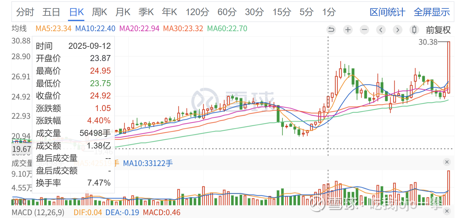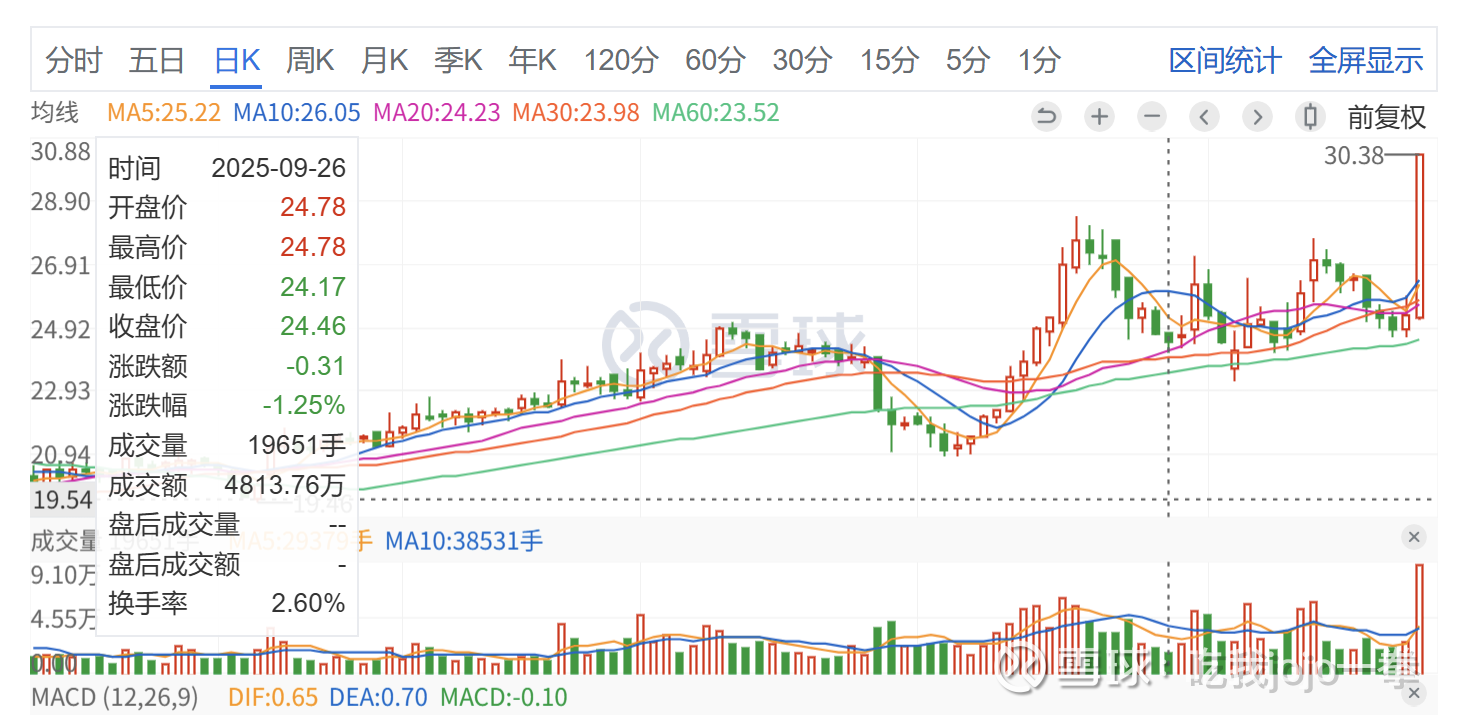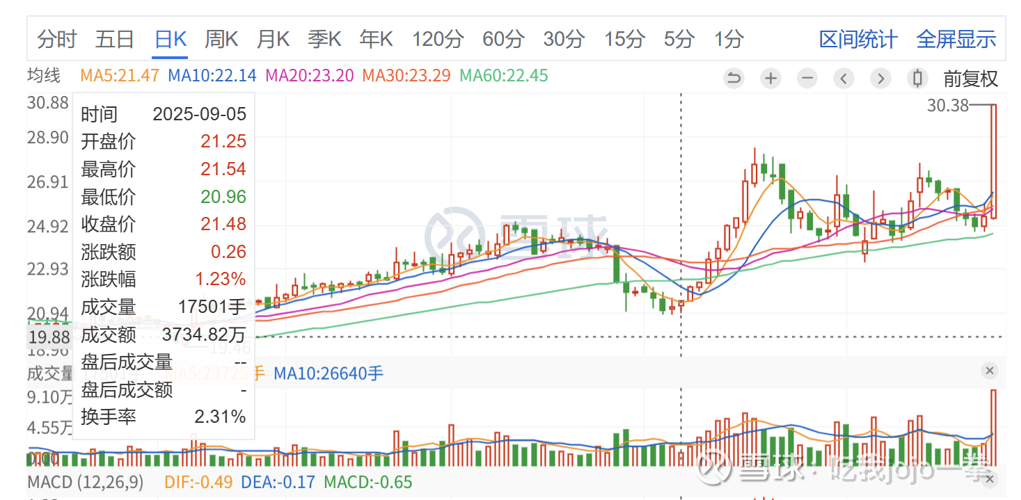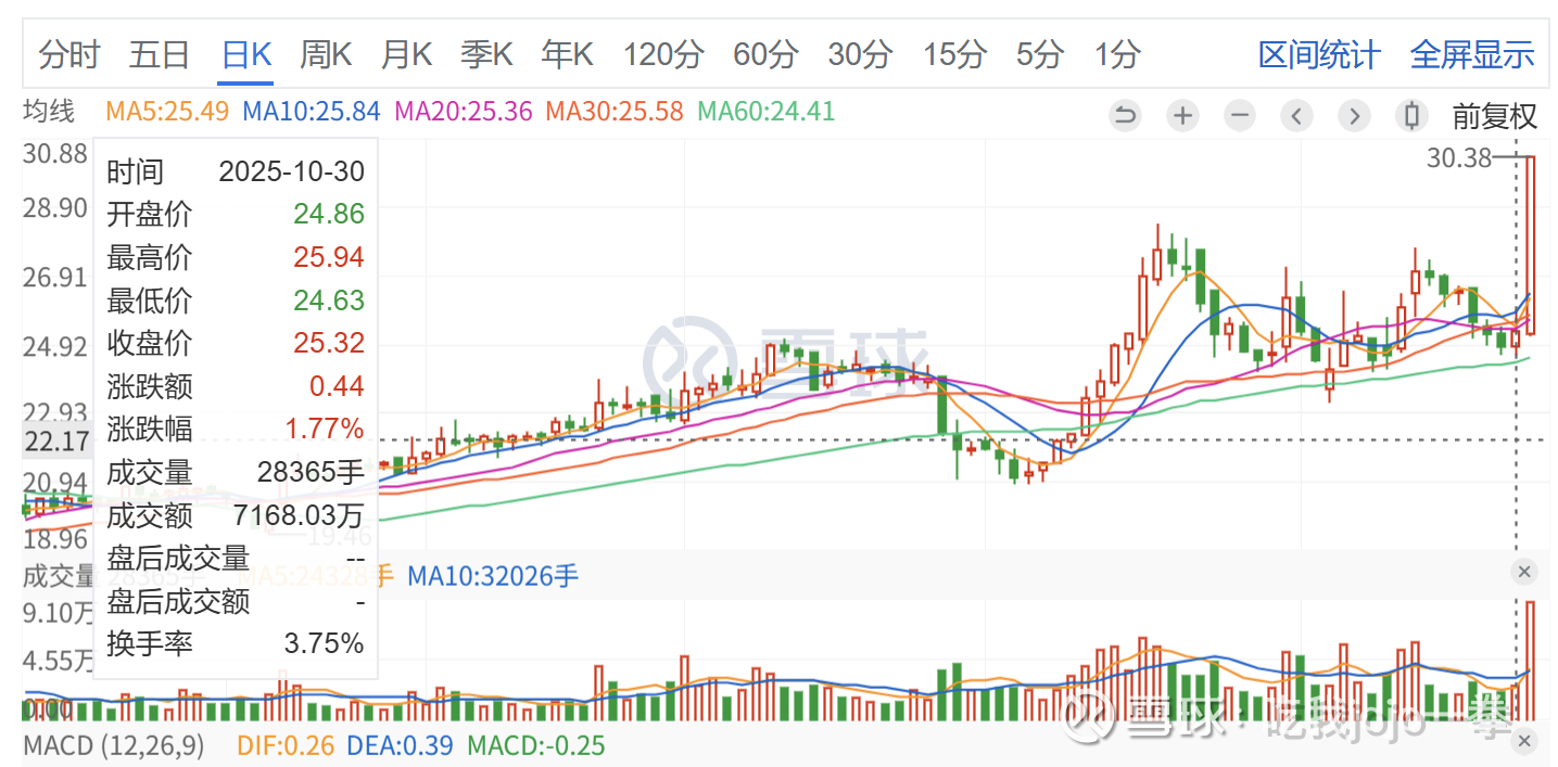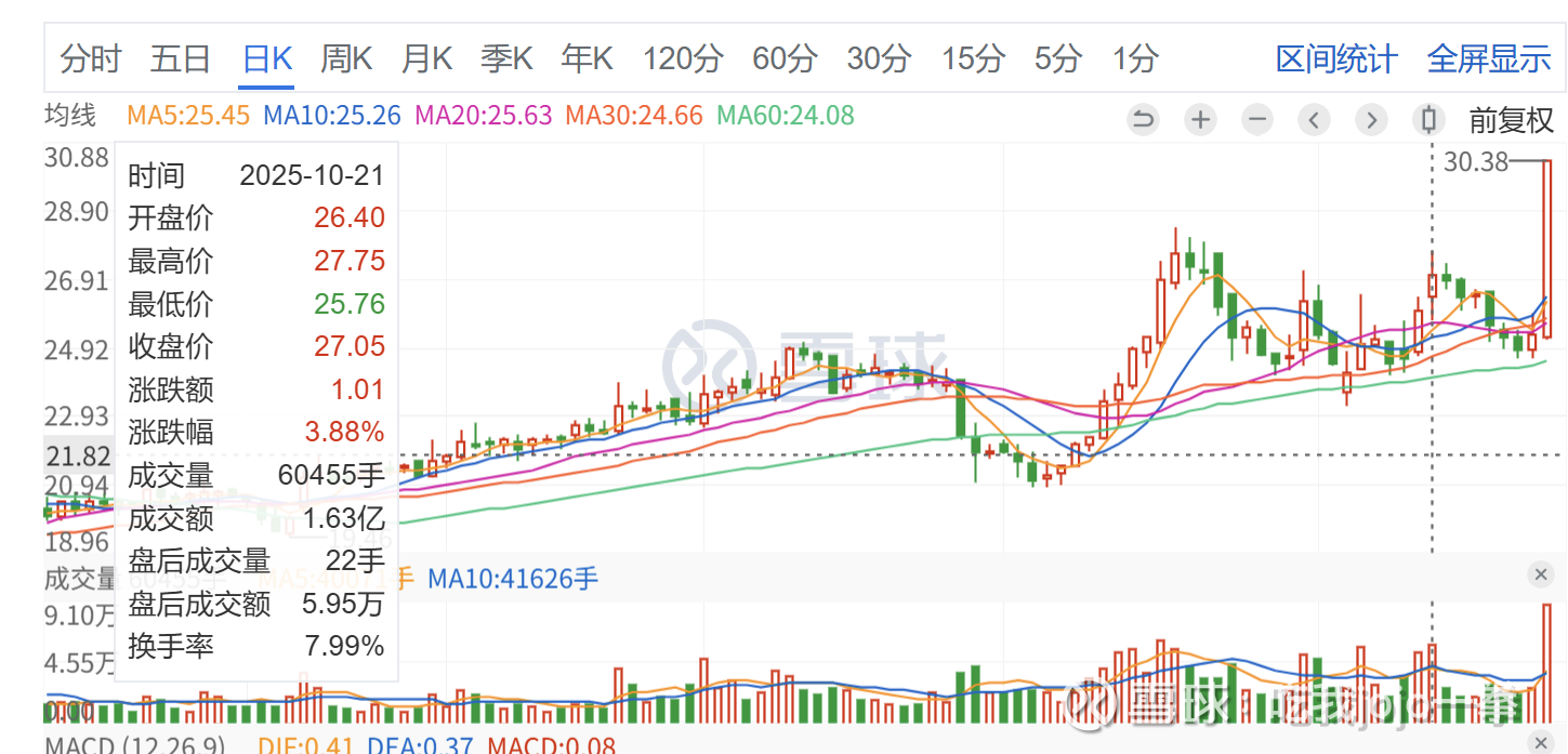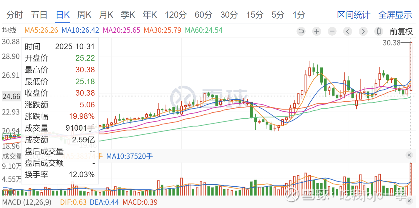 今日10月31日放量封板,成交9万手,30.38元,量价均创新高