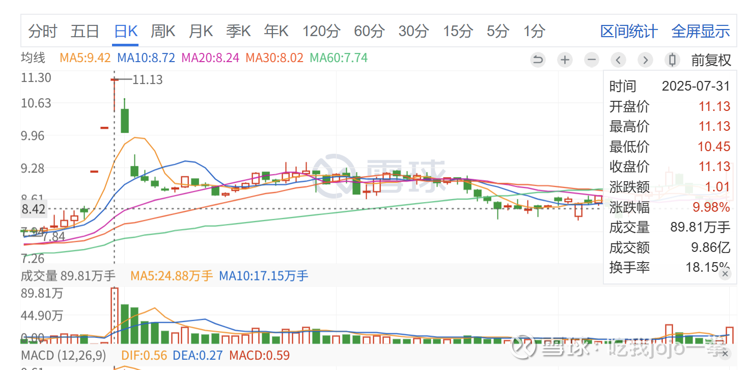前期巨量为7月31日,成交89万手,收盘价11.13元,前期一字板,当日巨量,虽然封板,但是这个量能远超平时几倍,见顶信号明显,后续放量收绿回调(第二天低开还是给了机会)