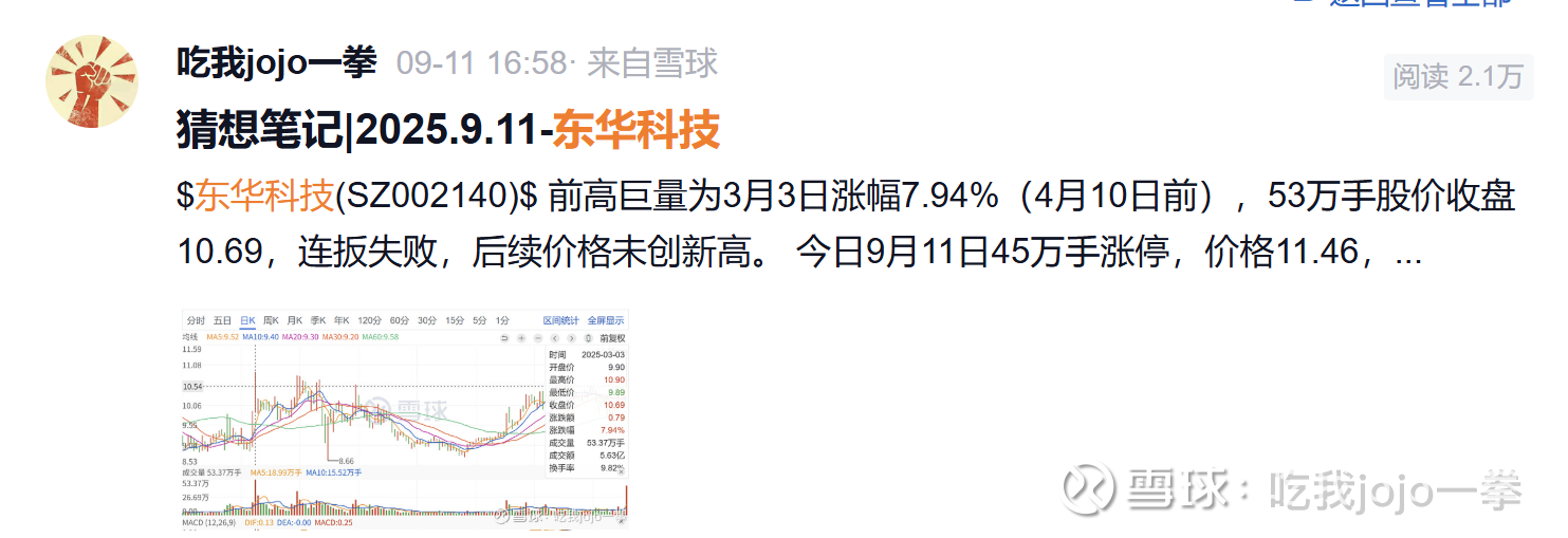 $东华科技(SZ002140)$ 首版分析过是一个低位U口之上拉板的一个经典态势,首版之后再次形成一个高位U口,冲高回调,今天再次封板,整体突破的形态已经构成,后续有持续追踪的价值和意义。