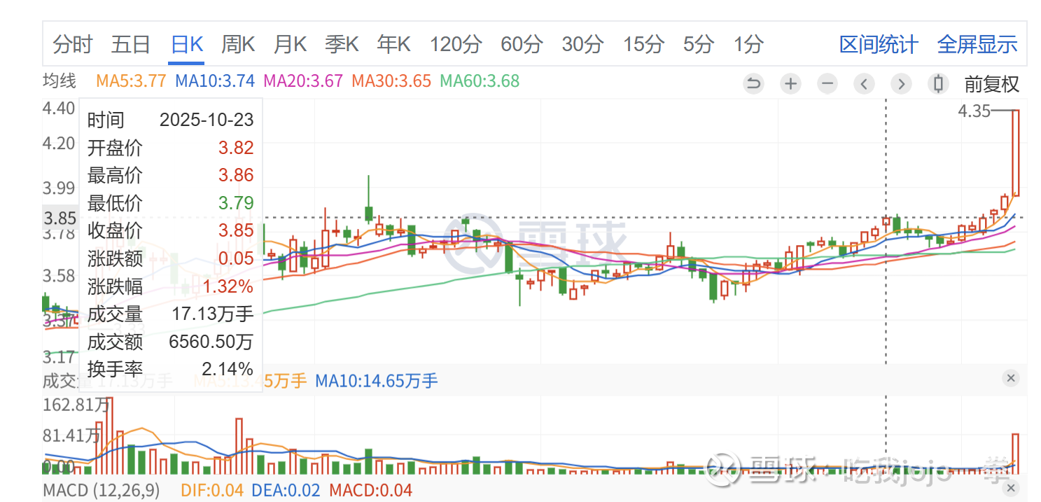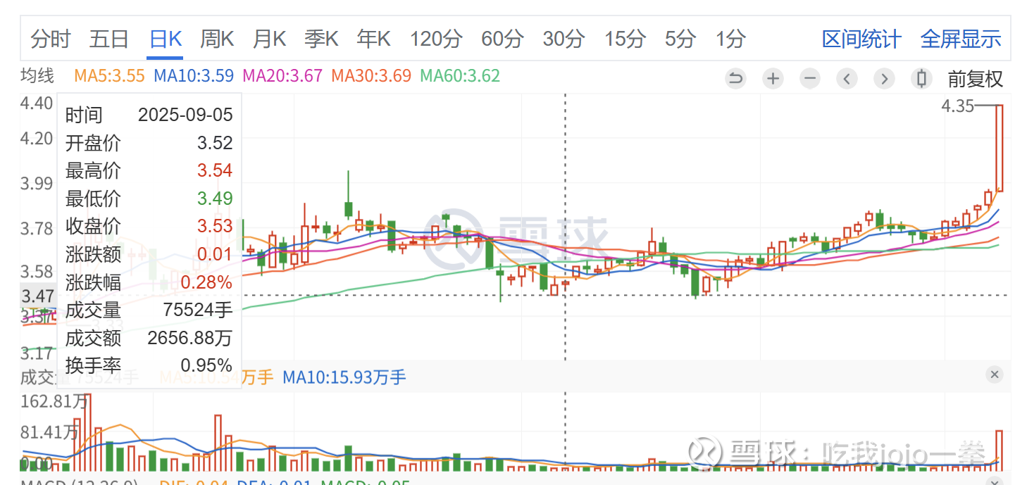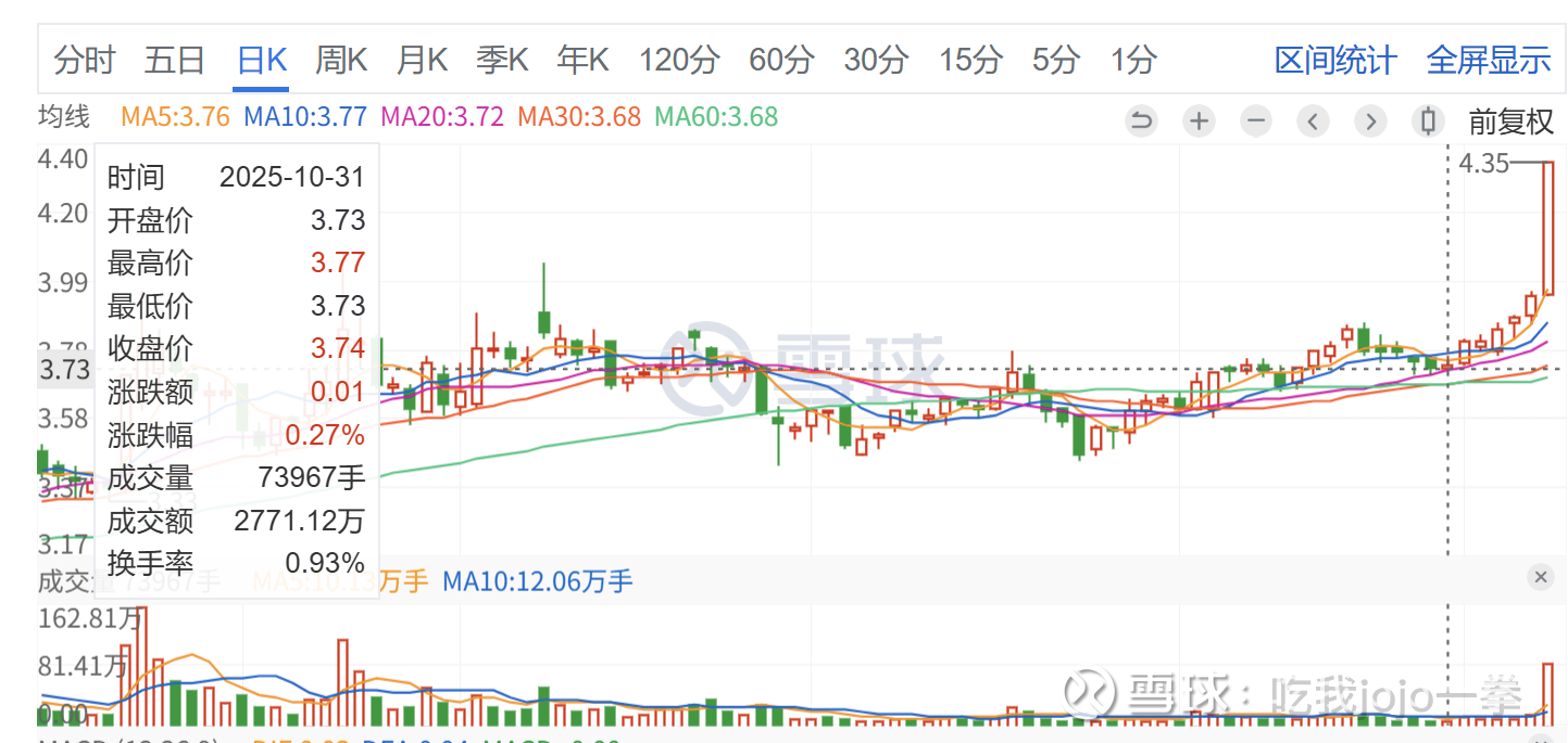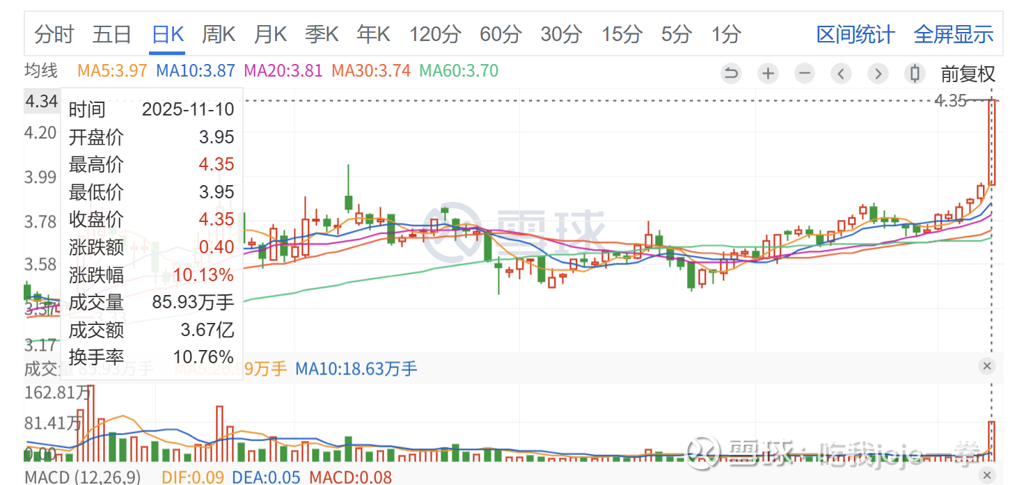 今天11月10日放量封板,成交85万手,收盘价4.35元,创阶段新高