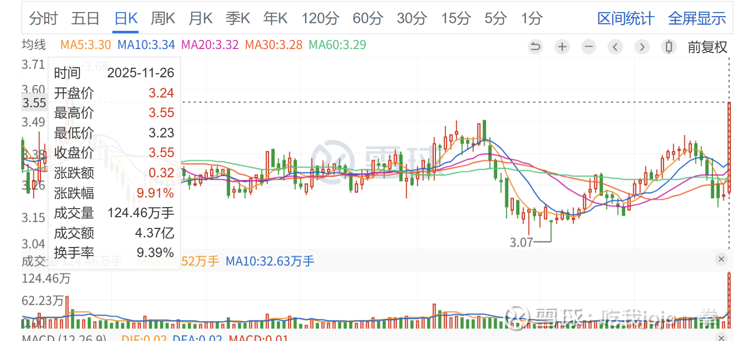 持续缩量下跌,不破前低位企稳,今天11月26日底部直接放量封板,成交124万手,收盘价3.55元,封口完整