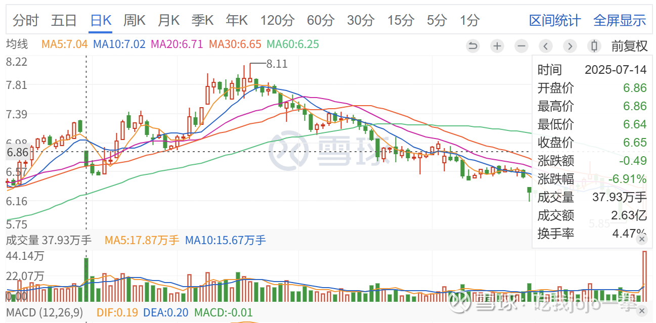 长期底部缩量拉升,前期巨量为7月14日,成交37万手,收盘价6.65元,巨量下跌后,放量上冲创新高,走出了一个W底,可惜新高缩量,当日未能守住,后续开启缩量下跌