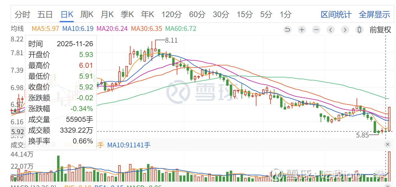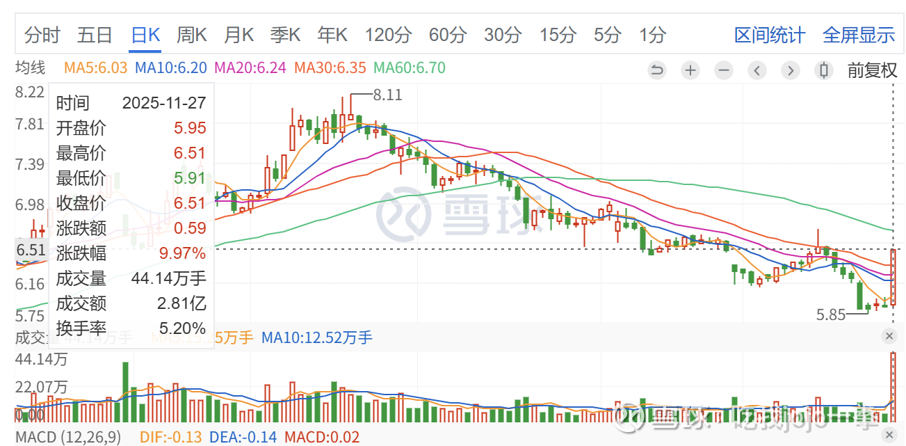 今天11月27日巨量封板,成交44万手,收盘价6.51元,价格封口完整,启动前地价出地量,也没有明显信号。