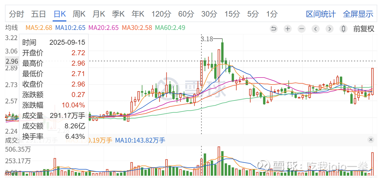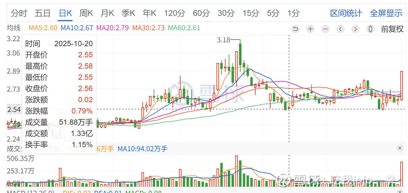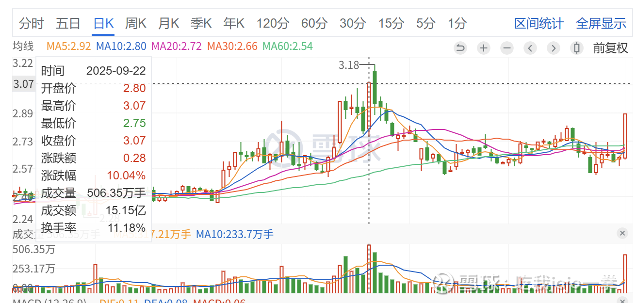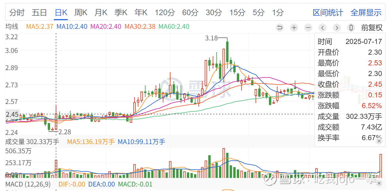 前期巨量为7月17日,成交302万手,收盘价2.45元,放量可惜未能封板,后续缩量企稳后开始上冲