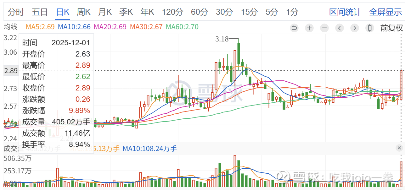 今天12月1日放量封板,成交量405万手,收盘价2.89元,价格封口完整
