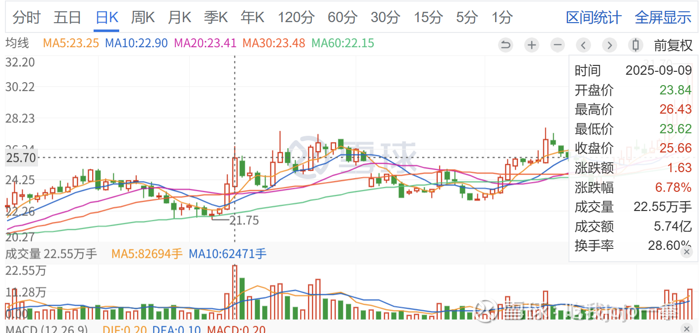 前期巨量为9月9日,成交22万手,收盘价25.66元,可惜当日没有封板,次日巨幅巨量收绿走势破坏(这就是我们经常说的形态走坏的经典特征)。