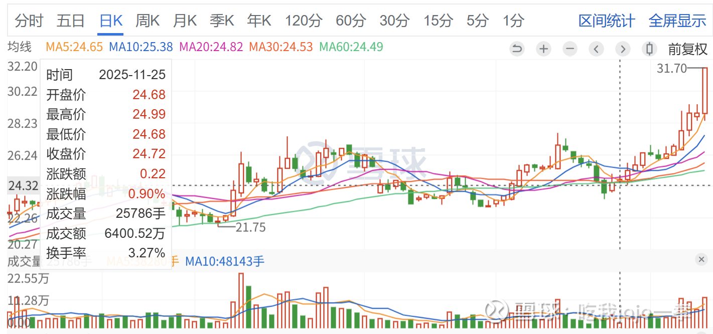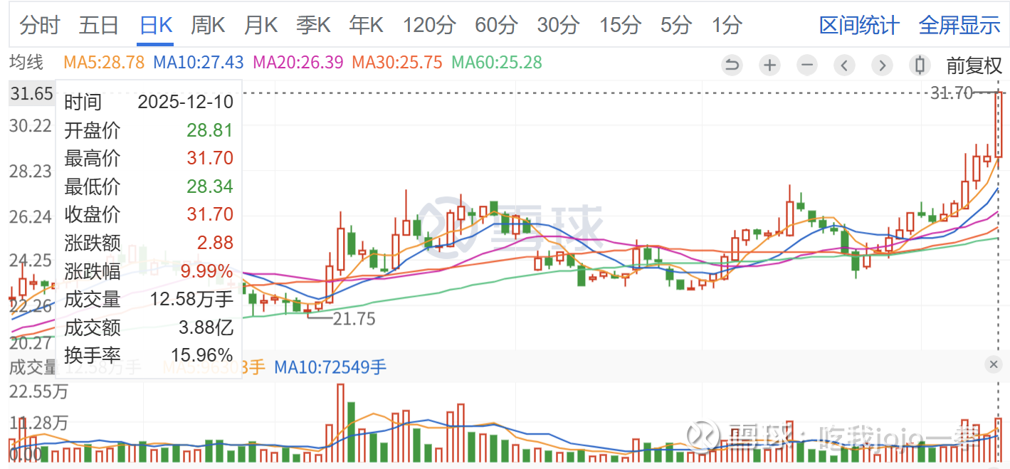今天12月10日放量封板,成交12万手,收盘价31.7,创新高。