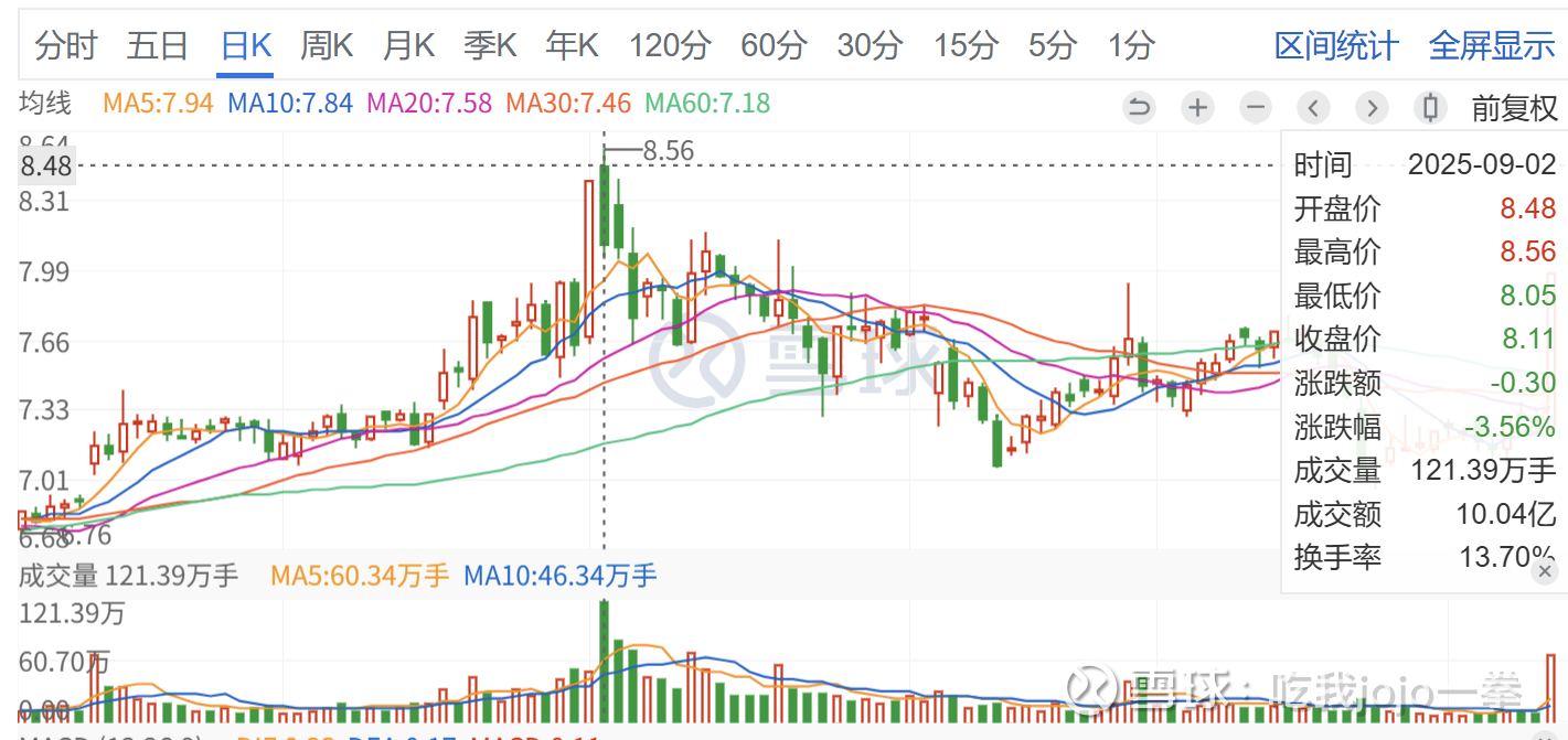 前期巨量为9月2日,成交121万手,收盘价8.11元,封板之后次日继续上冲,可惜当日巨幅巨量收绿走势破坏(这就是我们经常说的形态走坏的经典特征),虽创新高,但没有守住。