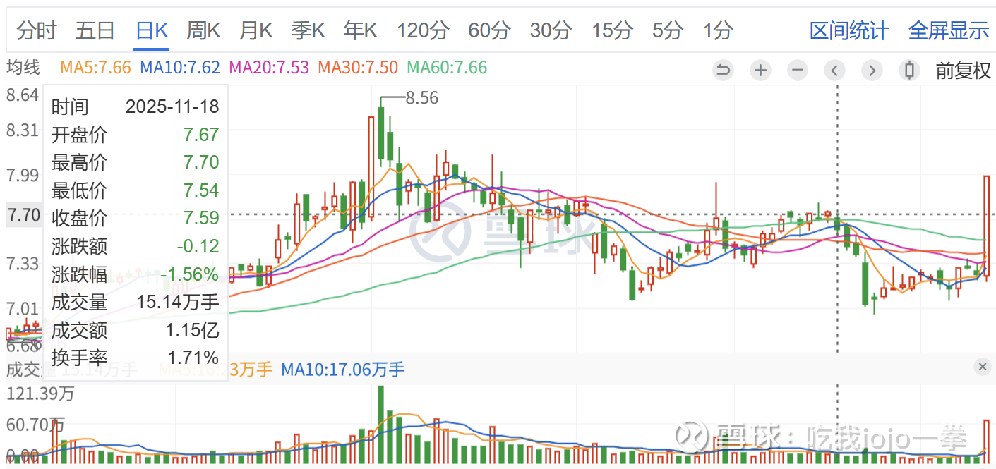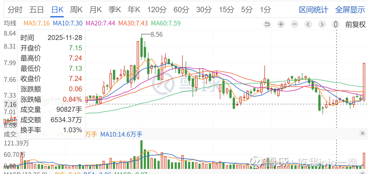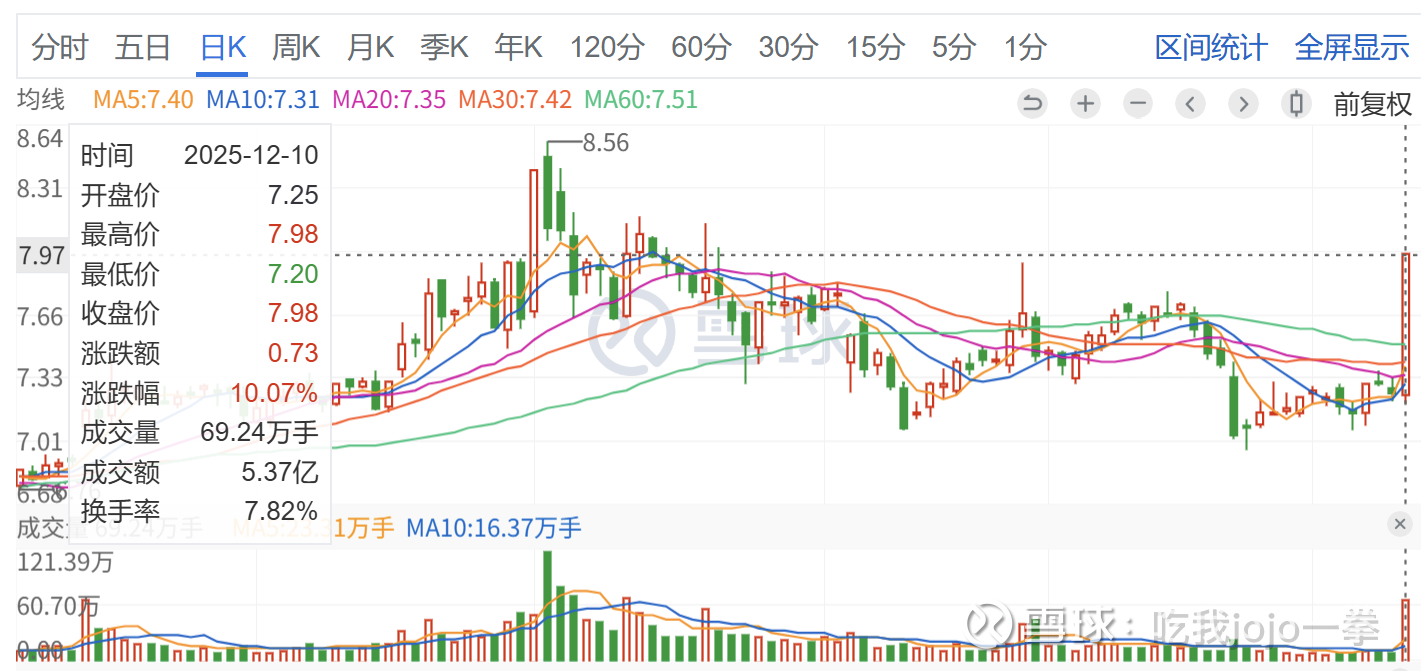 今天12月10日放量封板,成交69万手,收盘价7.98元,形成W底形态并封口箱体完整