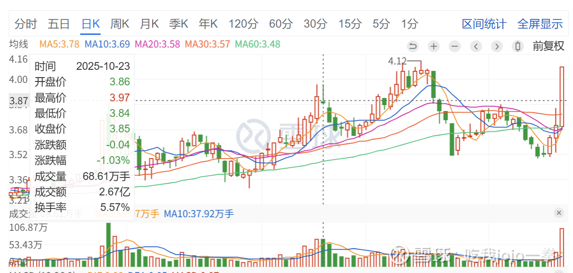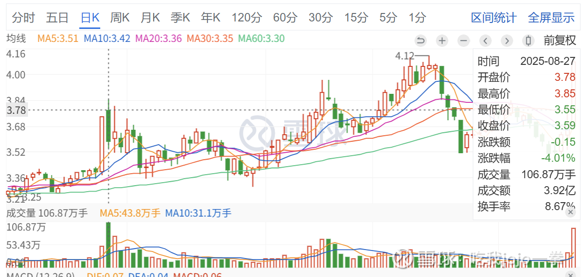 前期巨量为8月27日,成交106万手,收盘价3.59元,封板后次日放量拉升,当日可惜未能封板守住,放量收绿回踩,后续没有量能支持,开启缩量回踩,涨幅消耗一空