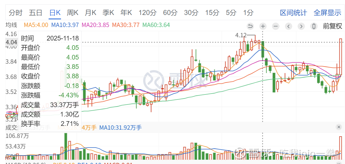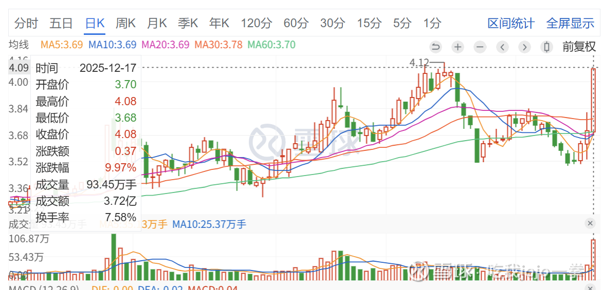 底部构筑双底,右底不破前低后开启放量拉升,比较经典,今天12月17日放量封板,成交93万手,收盘价4.08元,封口完整。