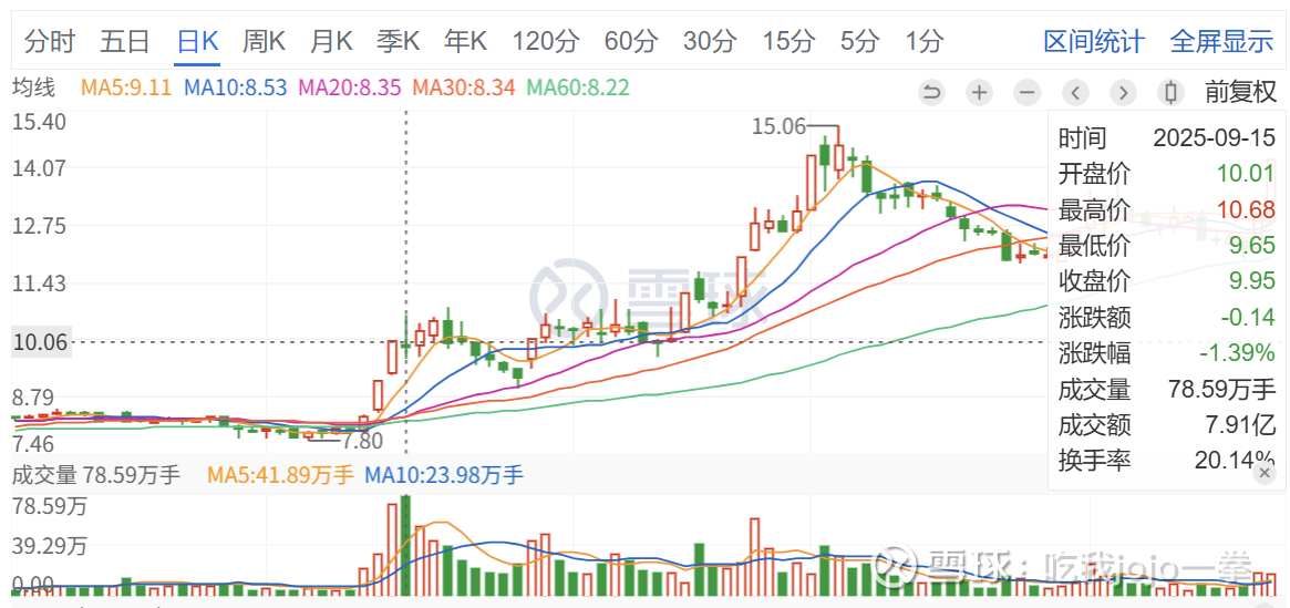 前期巨量为9月15日,成交78万手,收盘价9.95元,连续拉板后放量收绿,(这也是我们说的,巨幅巨量收绿封板价之上,并不是走坏的标志,需要看后续能否企稳封板价位置