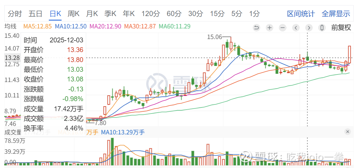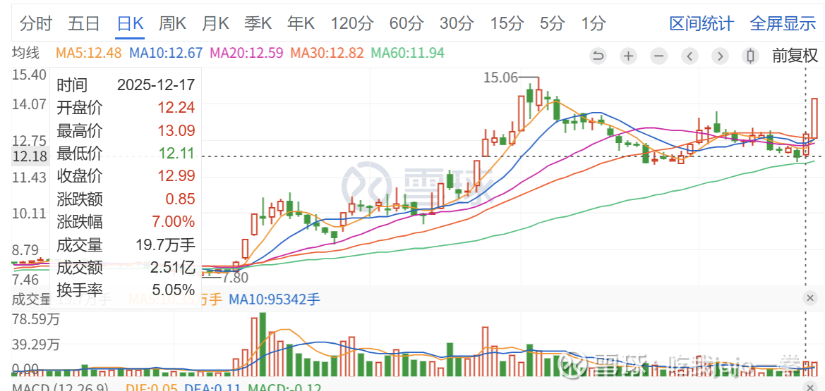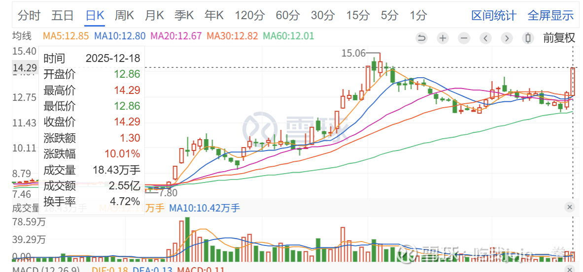 今天12月18日缩量封板,成交18万手,收盘价14.29元,未能封口