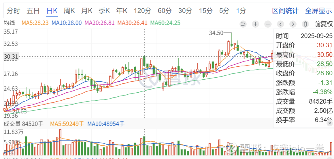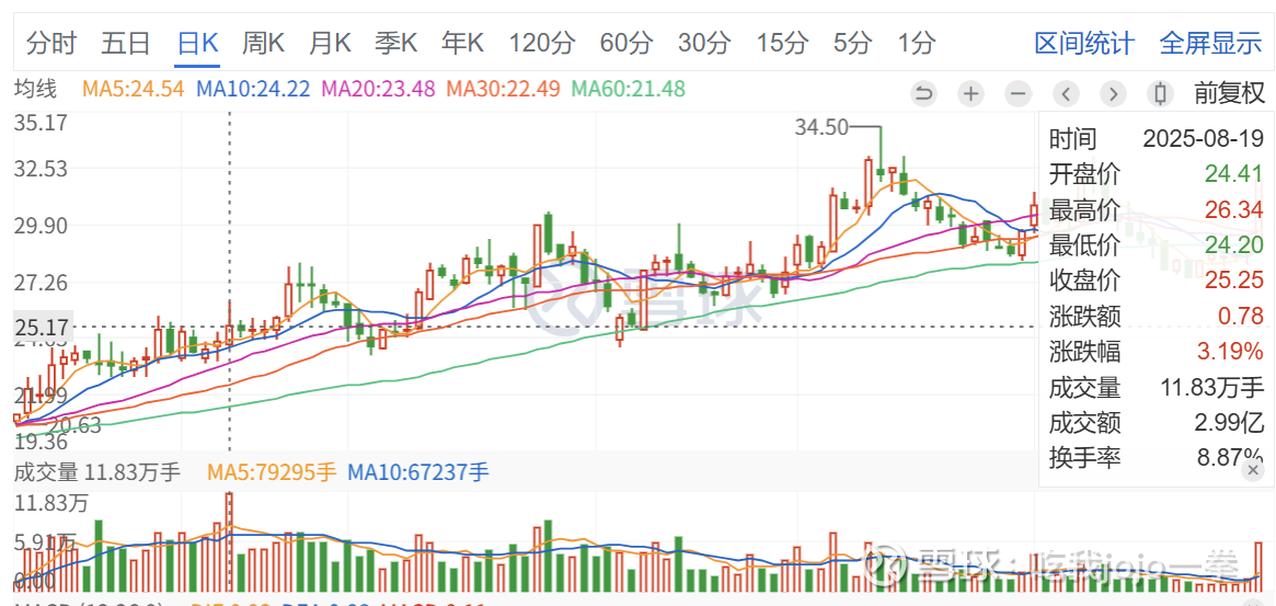 此股一路缩量拉升调整,前期巨量为8月19日,成交11万手,收盘价25.25元,量新高之后,开启缩量拉升直创新高。