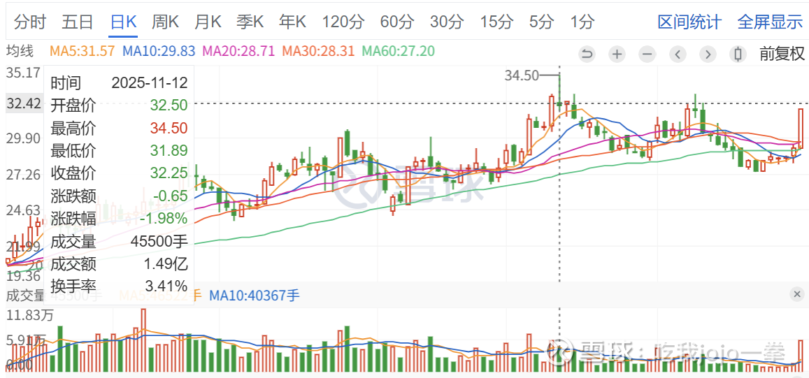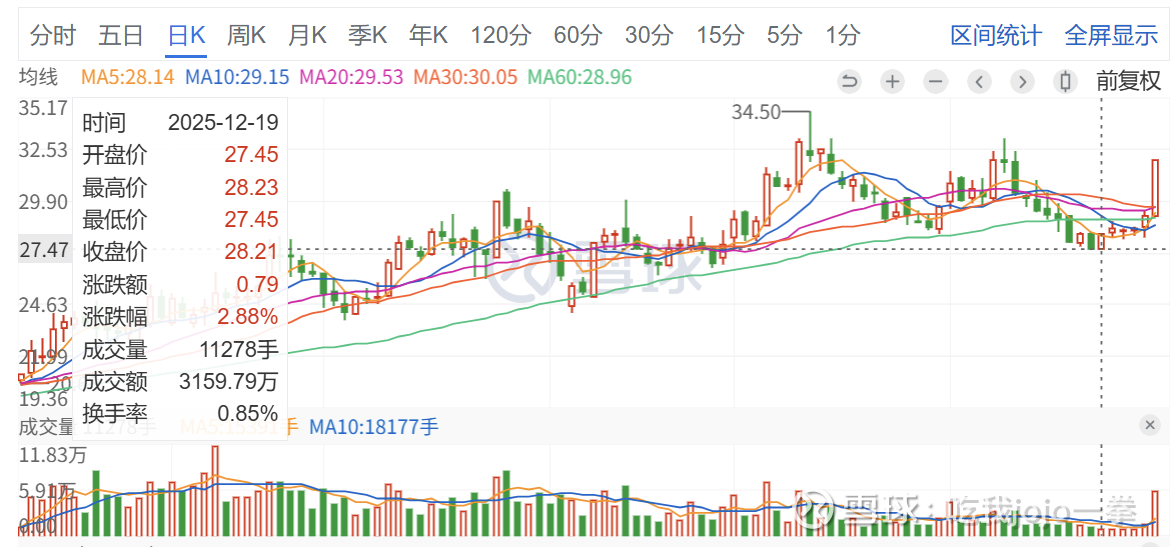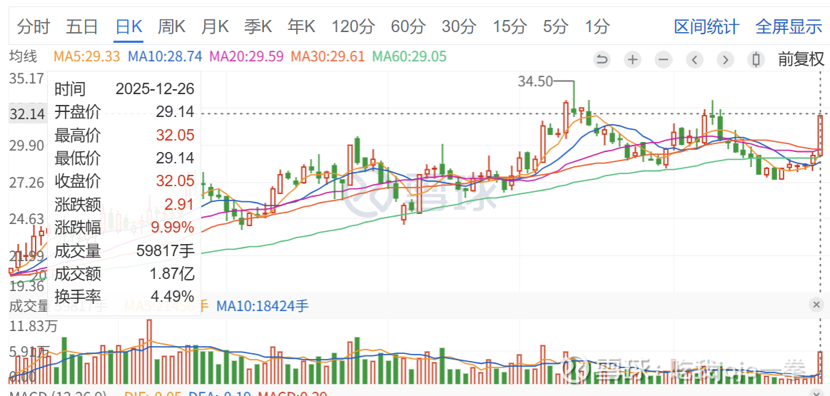 今天12月26日放量封板,成交5.9万手,收盘价32.05元,封口完整,接近高点