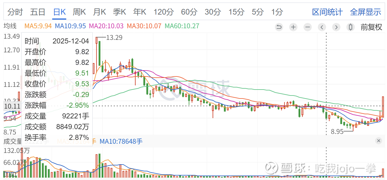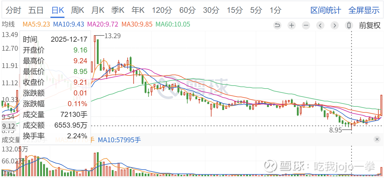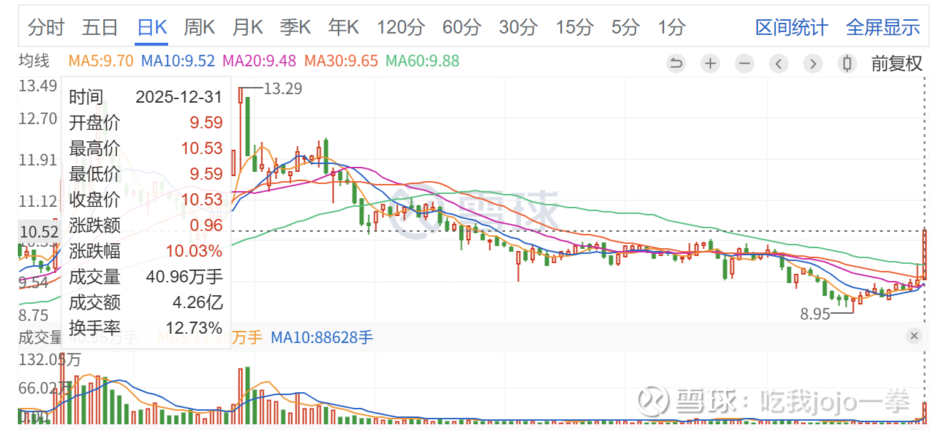 今天12月31日放量封板,成交40万手,收盘价10.53元,封口前期平台