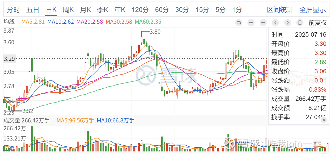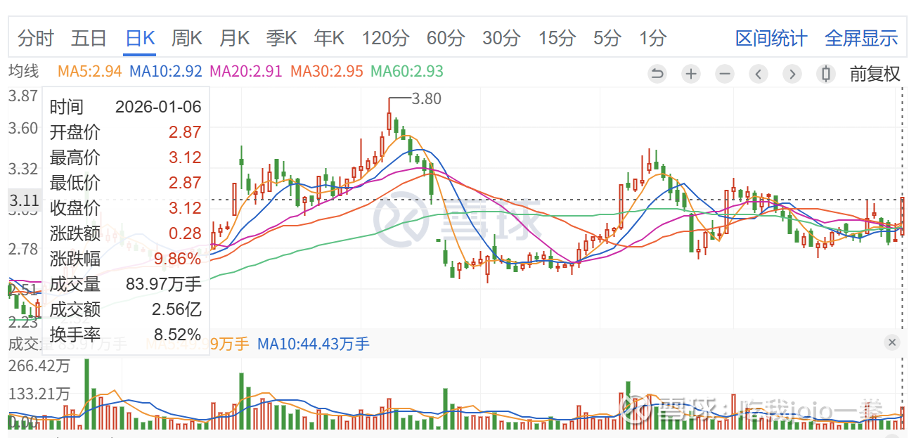 今天1月6号,放量封板,成交83万手,收盘价3.12元,未能封口。