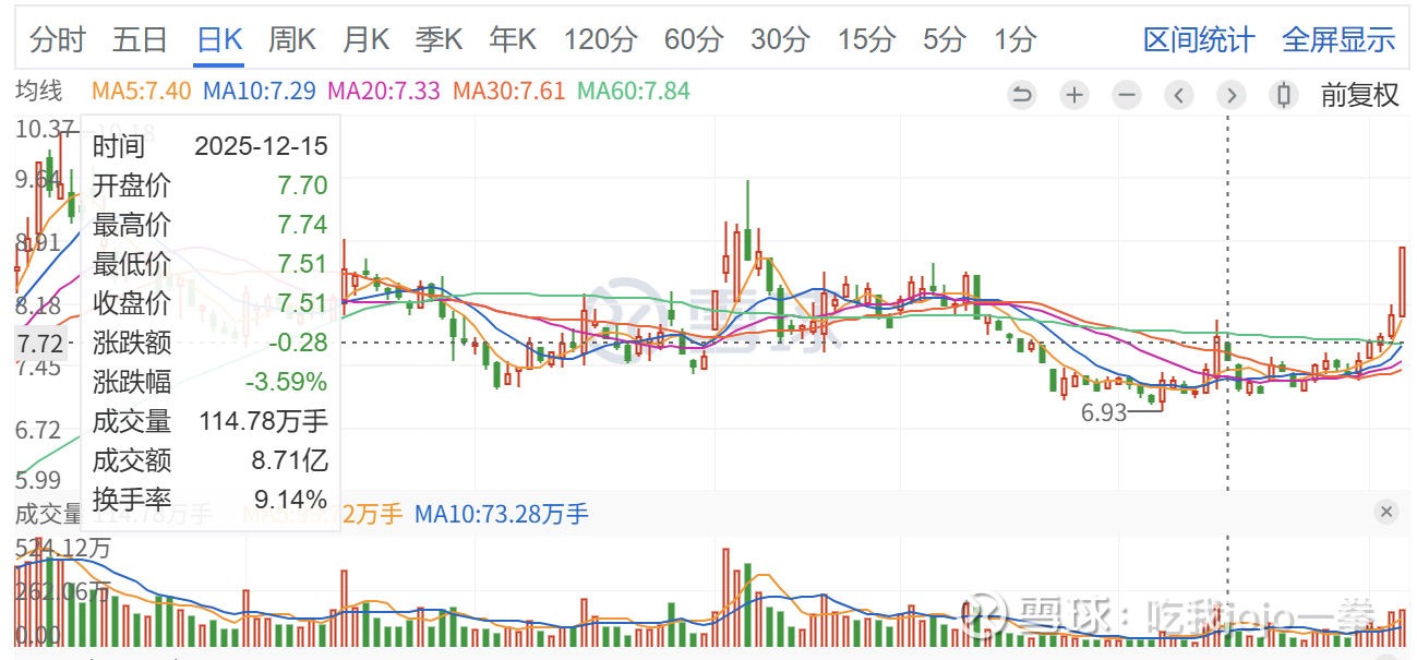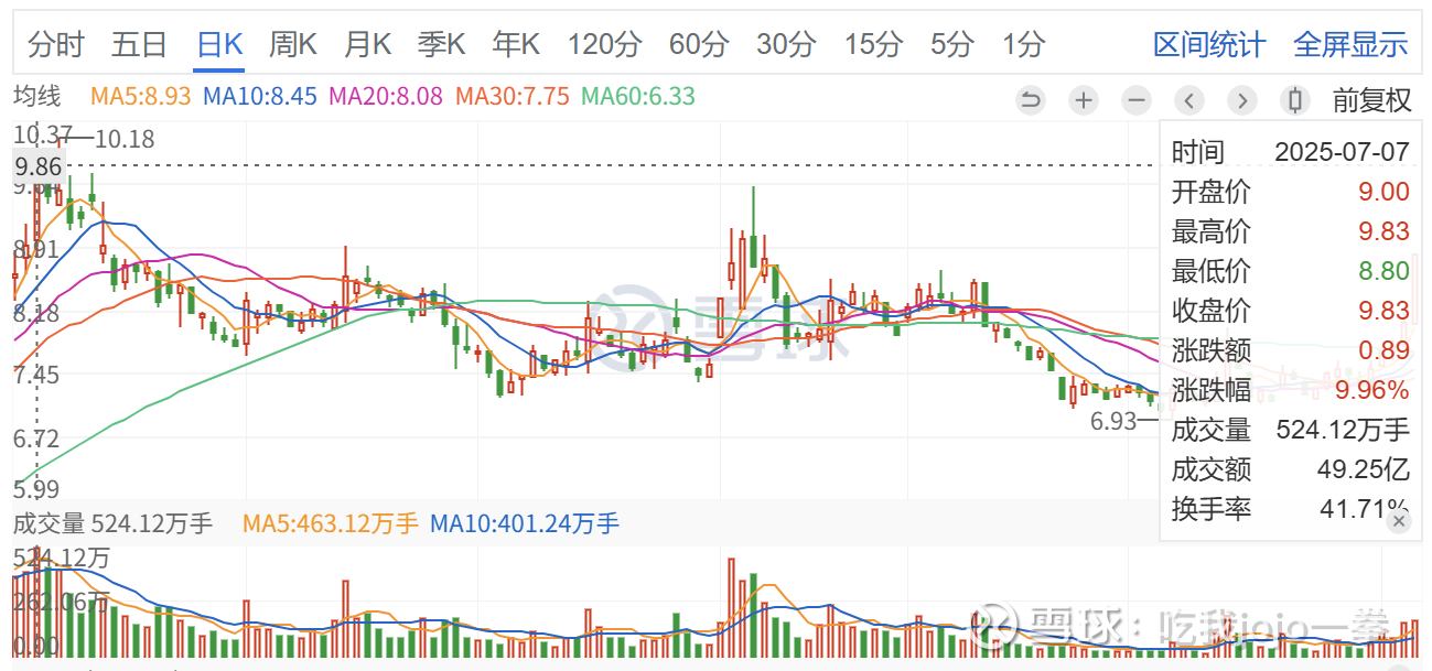 此股一路缩量拉升创新高后调整,前期巨量为7月7日,成交524万手,收盘价9.83元,当日封板,后续缩量高位调整滞涨,缩量收绿开启回踩调整。