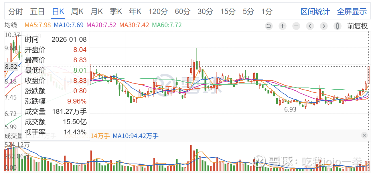 底部企稳未破前低,再次放量拉升,今天1月8日缩量封板,成交181万手,收盘价8.83元,价格封口完整。