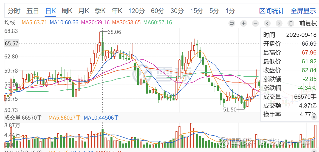 前期大箱体调整,前期巨量为9月18日,成交6万手,收盘价62.84元,一路拉升创新高,可惜当日未能守住,次日再次创新高也未能守住反而巨量巨幅收绿,后续缩量调整,走势破坏,开启缩量持续下跌。还是比较强势,顶部持续调整。