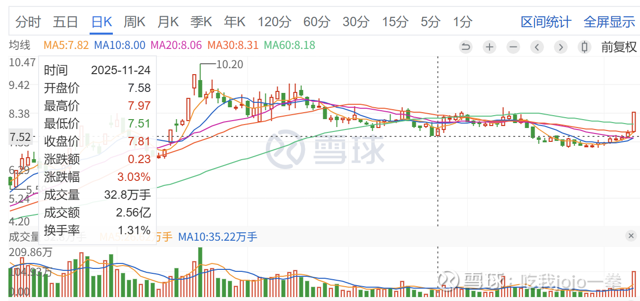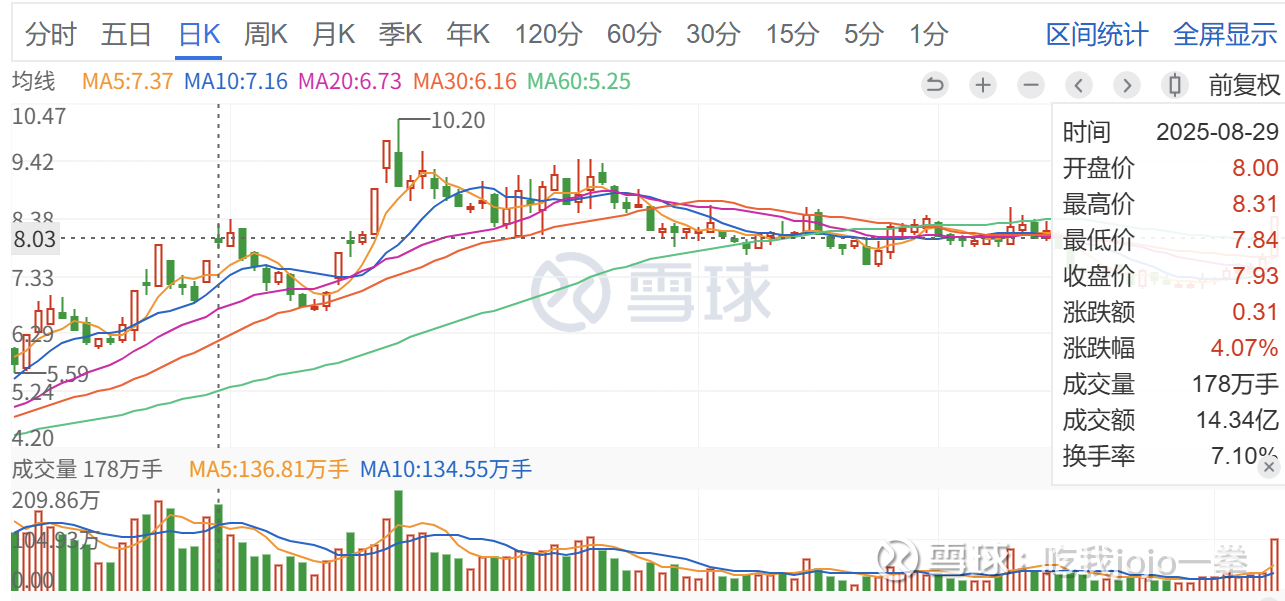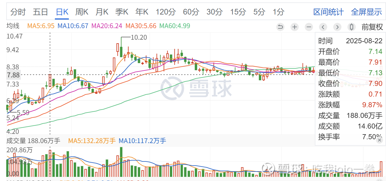 前期一路上冲拉升,前期比较高的巨量,一次为8月22日,成交188万手,收盘价7.9元,差一点封板,可惜当日未能守住,次日巨量巨幅收绿收盘价之下,后续缩量调整,走势破坏。还是比较强势,后续直接封板反弹。