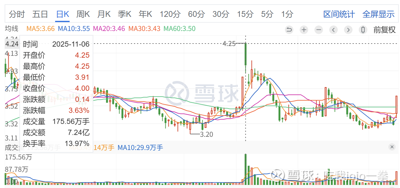 前期巨量为11月6日,成交175万手,收盘价4元,封板后继续巨幅巨量拉升,可惜当日未能封板成功守住,反而收绿,次日巨量巨幅收绿收盘价之下,连续缩量收绿走势变坏(之前的高点走势和这个类似)。