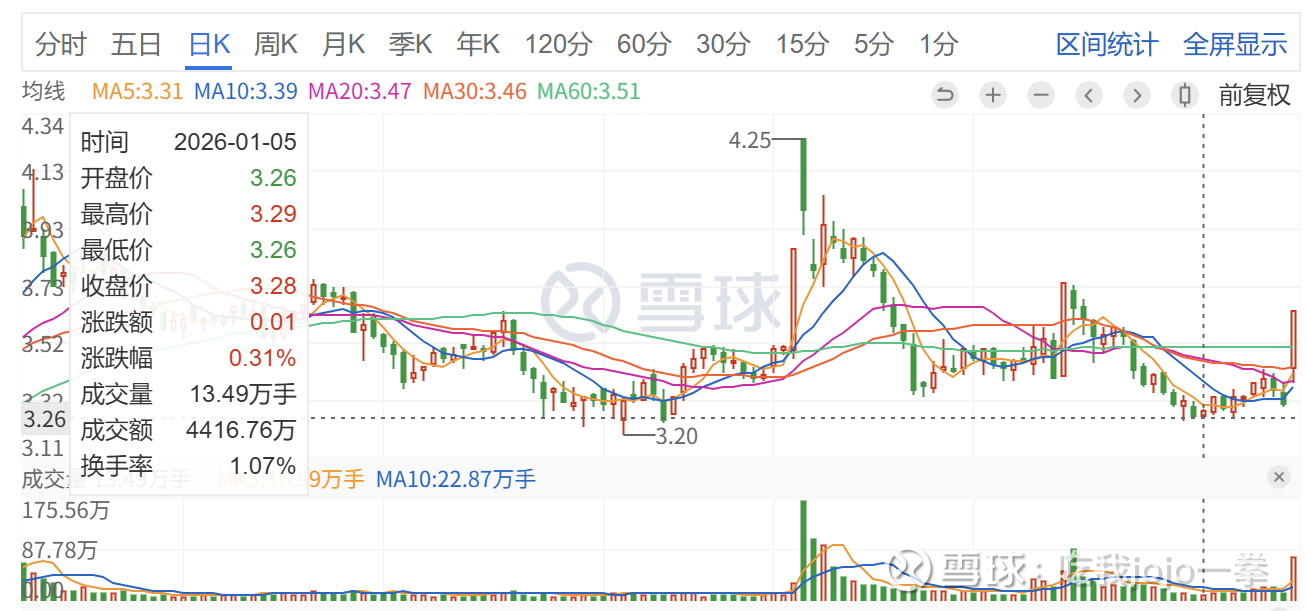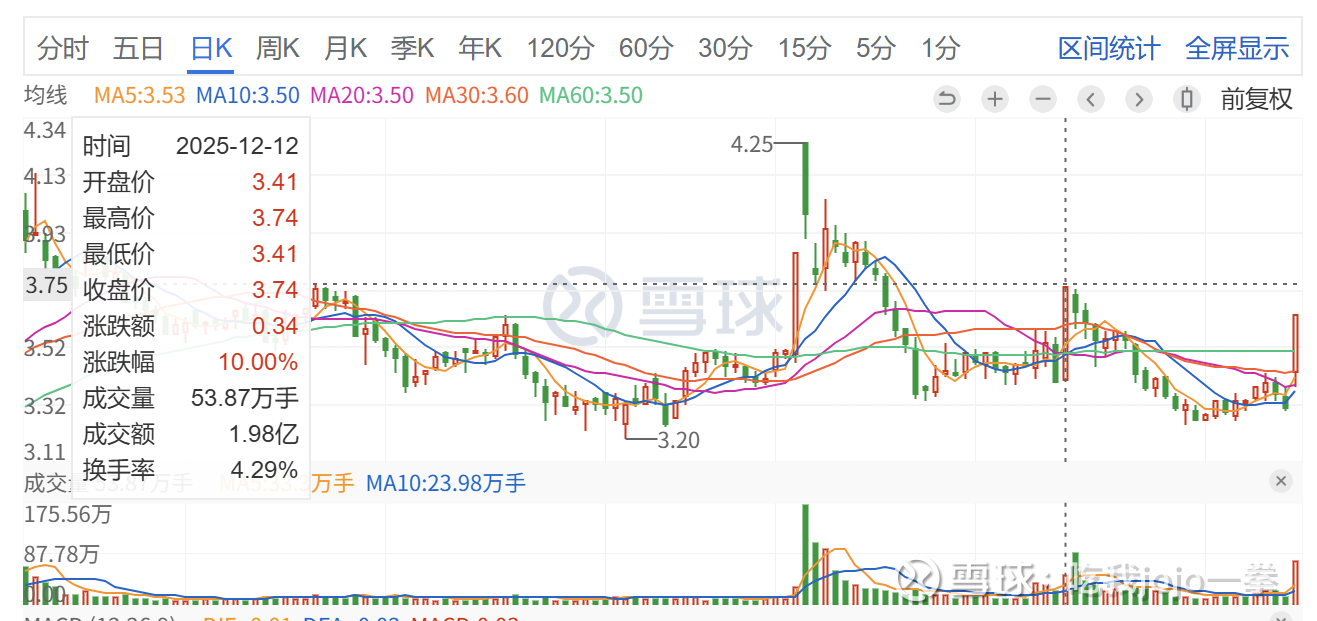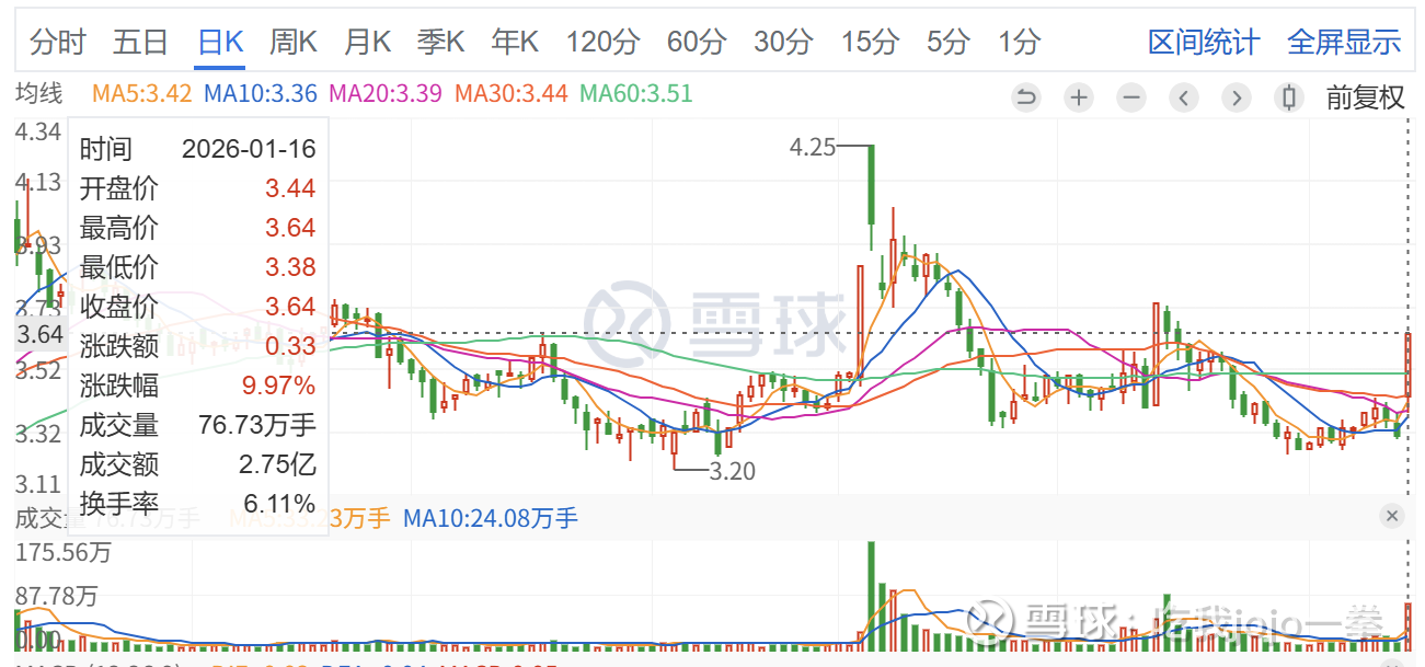 今天1月17日放量封板,成交76万手,收盘价3.64元,未能封口