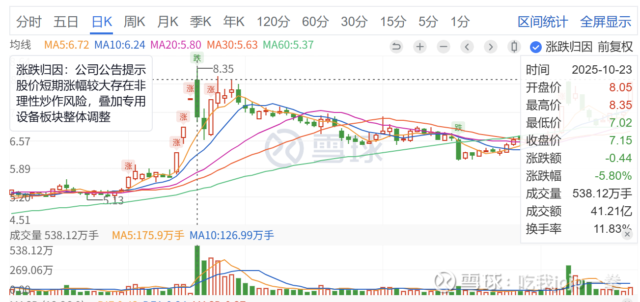 前期巨量为10月23日,成交538万手,收盘价7.15元,一路连板拉升后创新高,可惜当日没用守住,反而成巨幅巨量收绿收盘价之下(这也是我们说的,巨幅收绿收盘价之下,走坏的标志),后续虽然封板反弹,但持续缩量回踩,涨幅消耗一空。