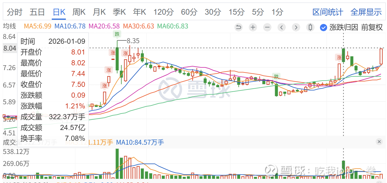 今天1月22日缩量封板,成交90万手,收盘价8元,封口完整