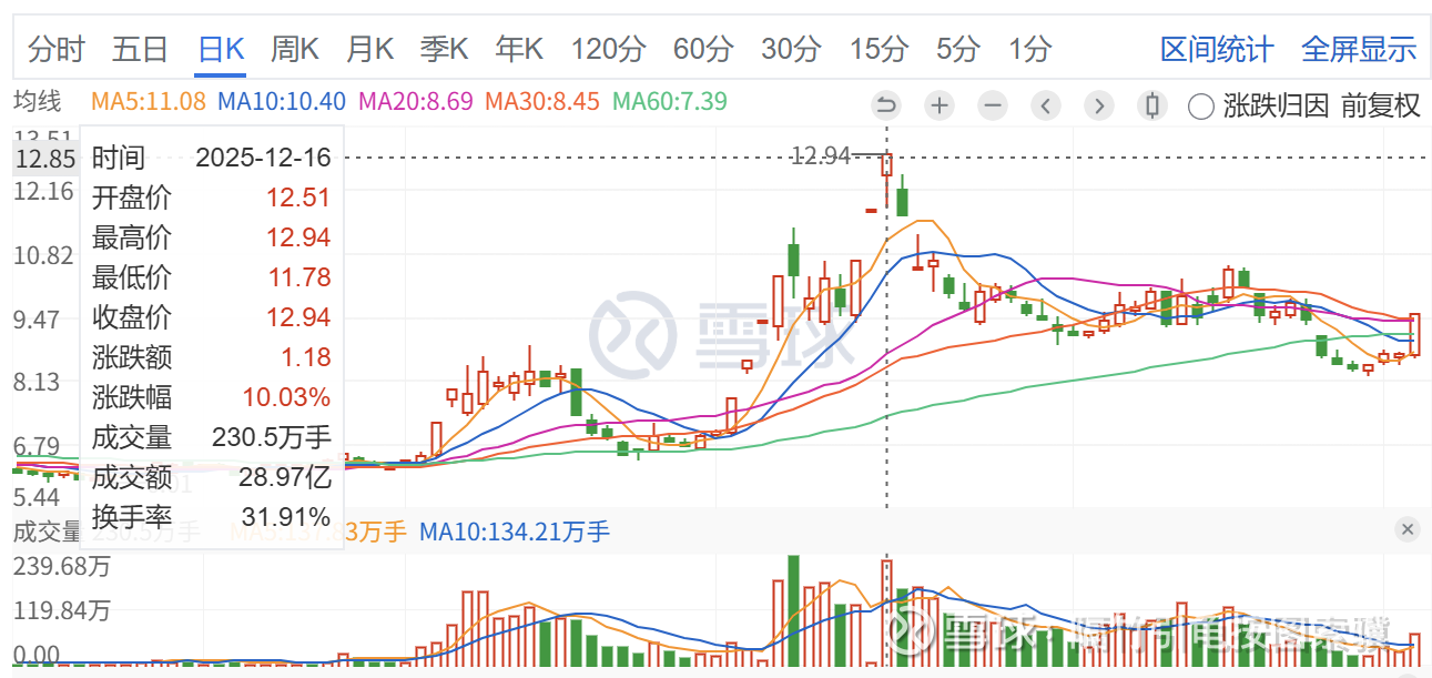 前期巨量为12月16日,成交230万手,收盘价12.94元,一路封板拉升后创新高,次日巨幅巨量收绿收盘价之下,(这也是我们说的,巨幅收绿收盘价之下,走坏的标志高位滞涨),后续开始持续跌停回踩