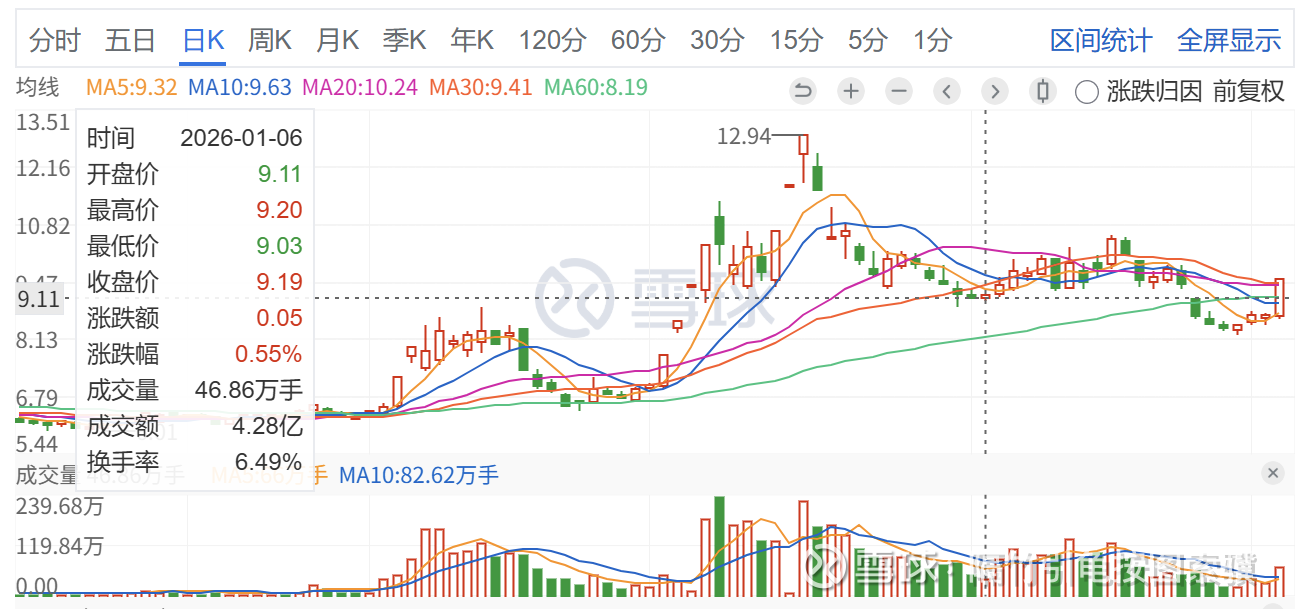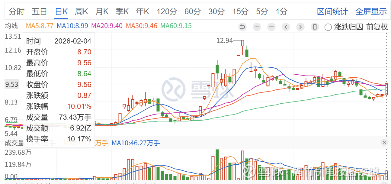 今天2月4日缩量封板,成交73万手,收盘价9.56元,封口不完整