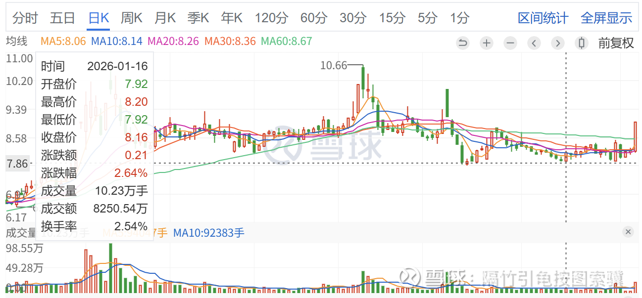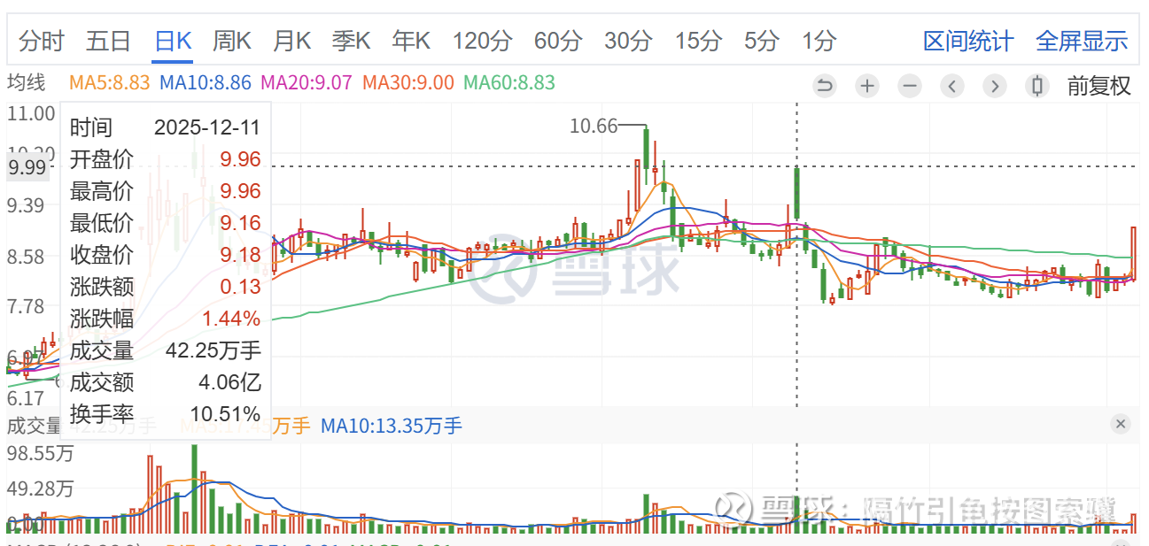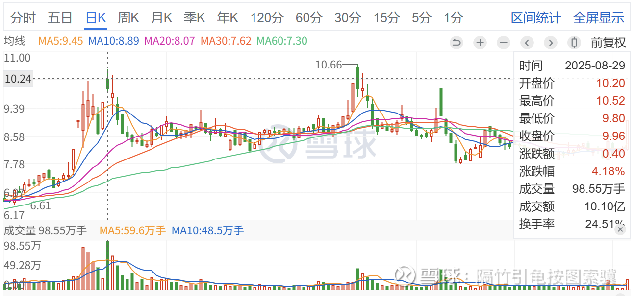 前期一路连板拉升,放量高点为8月29日,成交98万手,收盘价9.96元,连续封板之后再创新高,可惜当日没有守住,反而巨幅巨量收绿,次日巨幅巨量收红但是收盘价之下,开始走坏,缩量调整回踩。